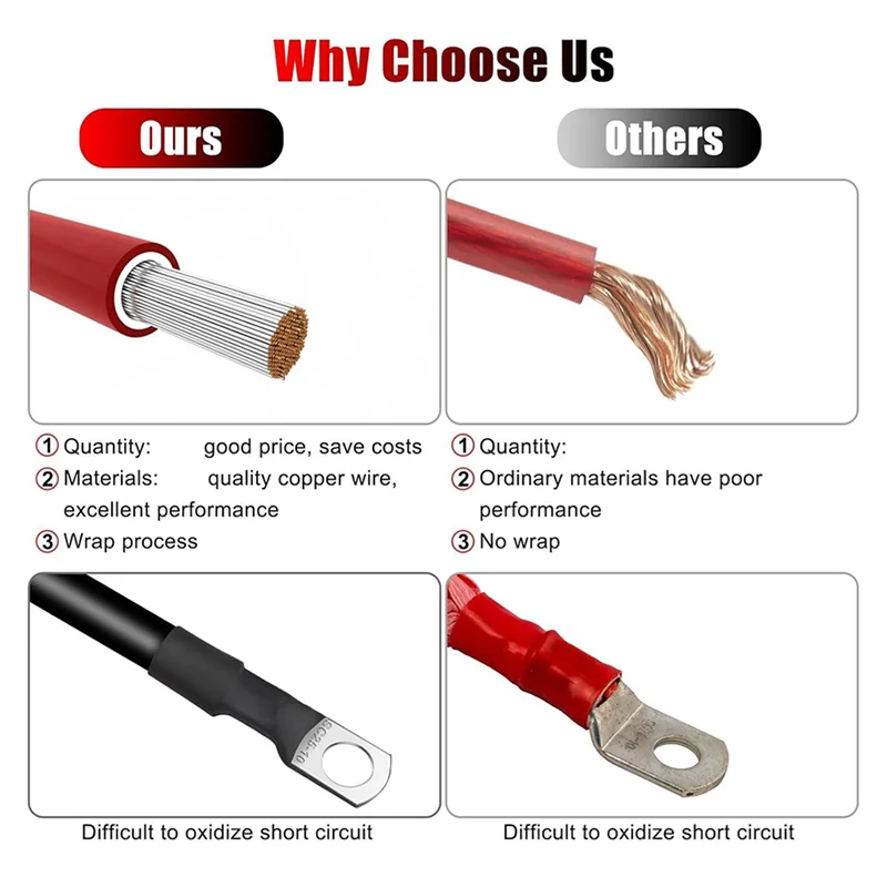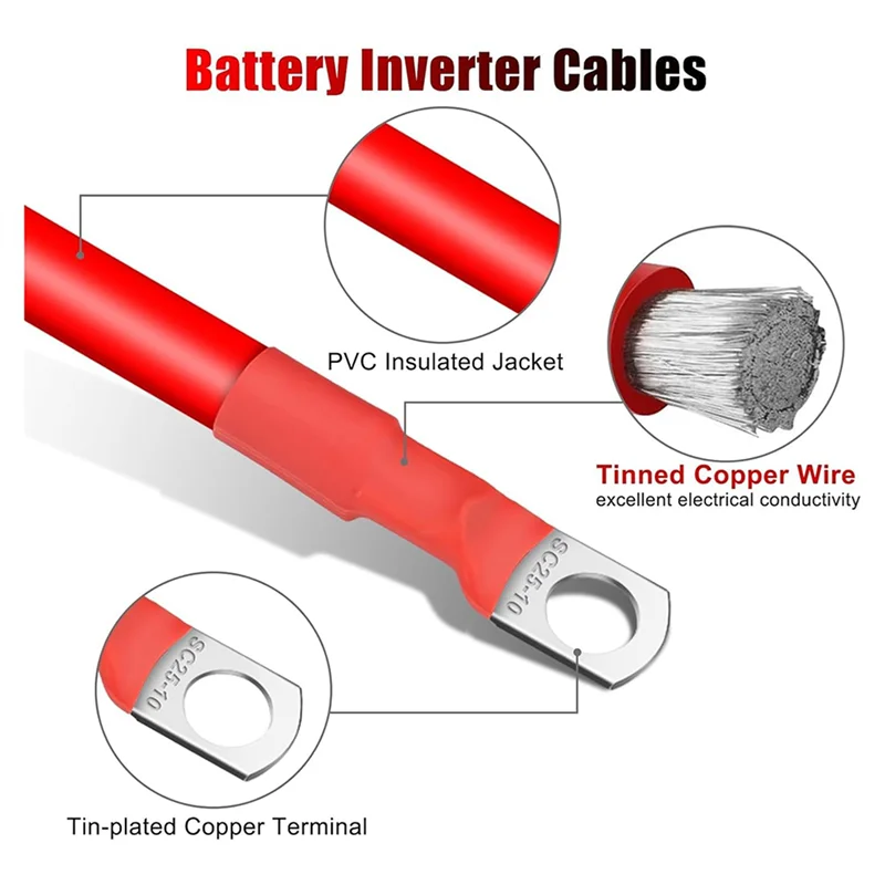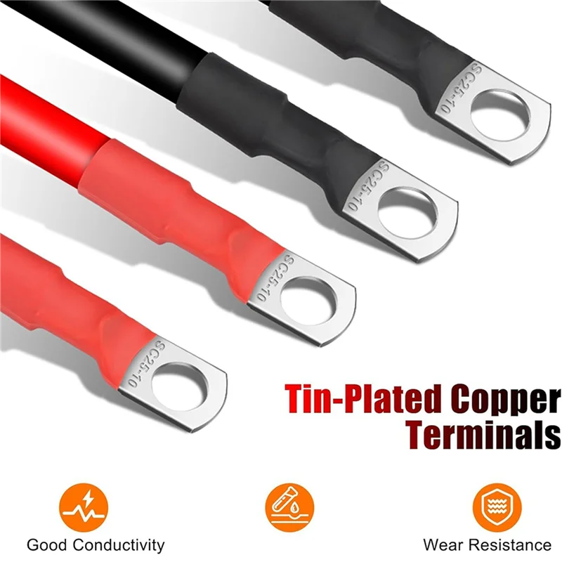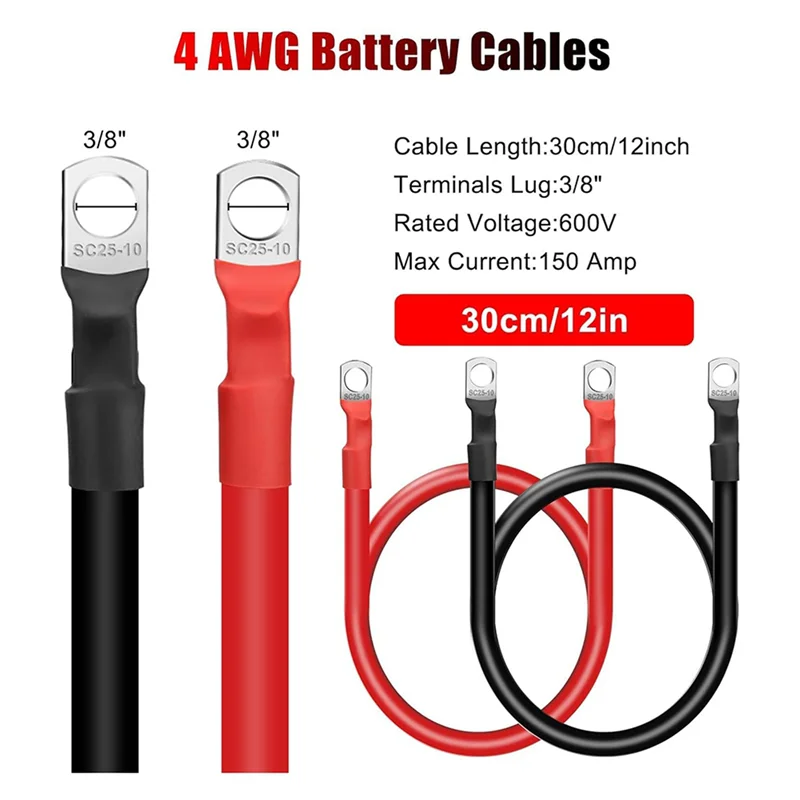 Comprehensive Set: This package includes 12pcs 4 AWG, 30 cm (12 inches) long battery cables, featuring both positive (red) and negative (black) copper power inverter wires. These are perfect for creating reliable parallel or series connections in various setups. Superior Conductivity and Durability: Equipped with 3/8Inch Lugs Tin-plated copper terminals, these 4 Gauge auto battery cables offer excellent stability, wear resistance, and corrosion resistance, ensuring long-lasting performance in diverse conditions. Robust Insulation: Each cable is encased in a flexible PVC insulation shell that is wear-resistant, waterproof, moisture-proof, and flame-retardant. This makes them suitable for harsh environmental conditions, providing reliable performance and safety. User-Friendly Design: Installation is made easy with pre-crimped 3/8Inch (M10) round center hole terminals on both ends of each cable. These are designed to fit 3/8Inch(M10) studs, simplifying the setup process for various applications. Versatile Applications: Ideal for a wide range of uses, these marine battery cables are extensively applicable in cars, trucks, boats, solar setups, battery pack wiring, grounding cables, and other automotive or lawn mower wiring needs.