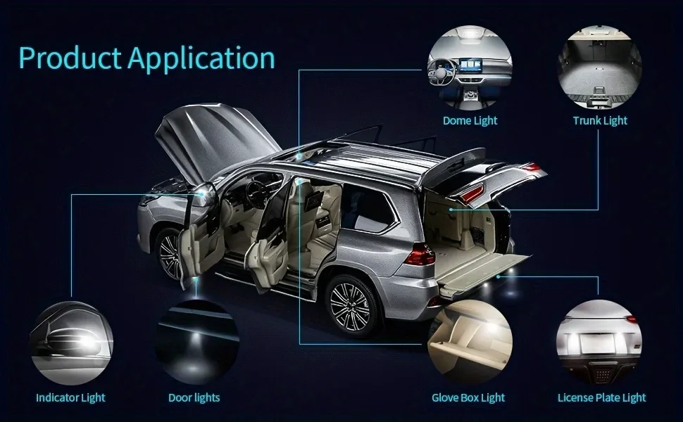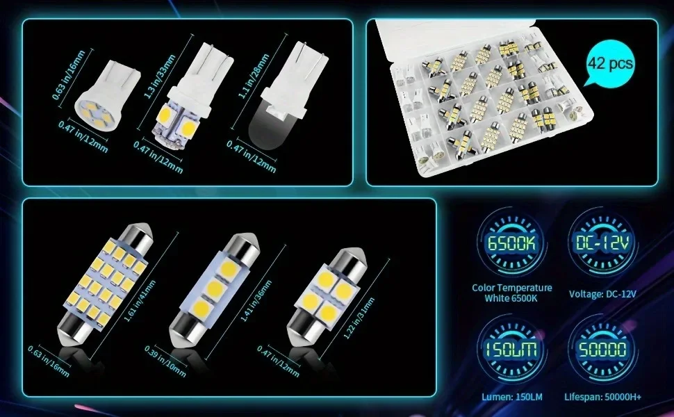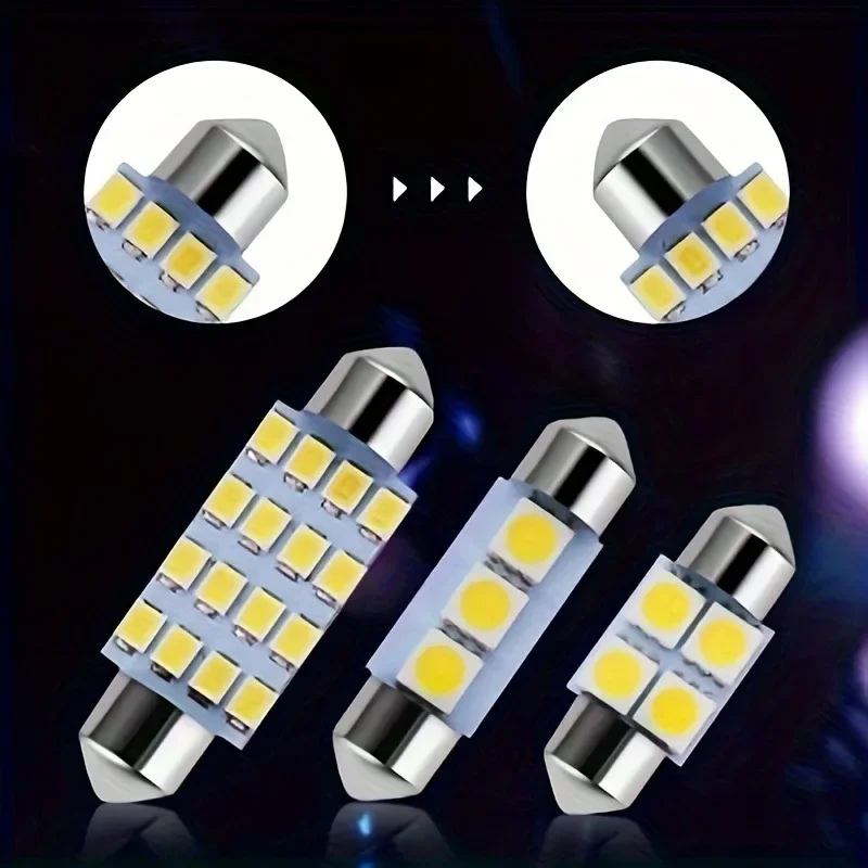 Specification Product Description : This Interior xenon white LED Kit Will Include The Following bulbs for general applications around the interior of your vehicle such as Dome, Map, Door, Glove Box, License Plates Etc. Cross Reference Guide: T10=W5W 12V 2825 192 194 158 168 501 921 175 PC175 906 904 161 etc. 31MM 12SMD Festoon = 560 578 211-2 212-2 214-2 2112 2122 QUICK SOLUTIONS FOR NON WORKING LED BULBS : If your new led bulb wont light up, take it out and Flip it 180 degrees ( to reverse the polarity). Please note for the Festoon lights you can move the metal clips closer or further apart so they can fit the festoon led bulb tighter, be gentle with the clips so they do not break. Package Including: 6 - T10 4-SMD leds 6 - 1157 1206 22SMD leds 6 - T10 0.2W leds 6 - T10 5smd leds 6 - T10 31mm 4SMD Map leds 6- T10 36mm 3SMD Map leds 6 - T10 41mm 16SMD Map leds (Totally 42PCS) Notice: 1. Please allow 1-3mm error due to manual measurement. 2. The colors may have different as the difference display, please understand. If you love my items, please turn to my homepage and click "follow". Be sure to add me to your favorites seller. Notice: 1. Please allow 1-3mm error due to manual measurement. Please make sure you do not mind before you bid. 2. The colors may have different as the difference display, please understand. Pictures: Due to the difference between different monitors, the picture may not reflect the actual color of the item. We guarantee the style is the same as shown in the pictures, but not the same performance on different bodies as on the model. Thank you and Have a nice shopping ! Packing list Package Including: 6 - T10 4-SMD leds 6 - 1157 1206 22SMD leds 6 - T10 0.2W leds 6 - T10 5smd leds 6 - T10 31mm 4SMD Map leds 6- T10 36mm 3SMD Map leds 6 - T10 41mm 16SMD Map leds