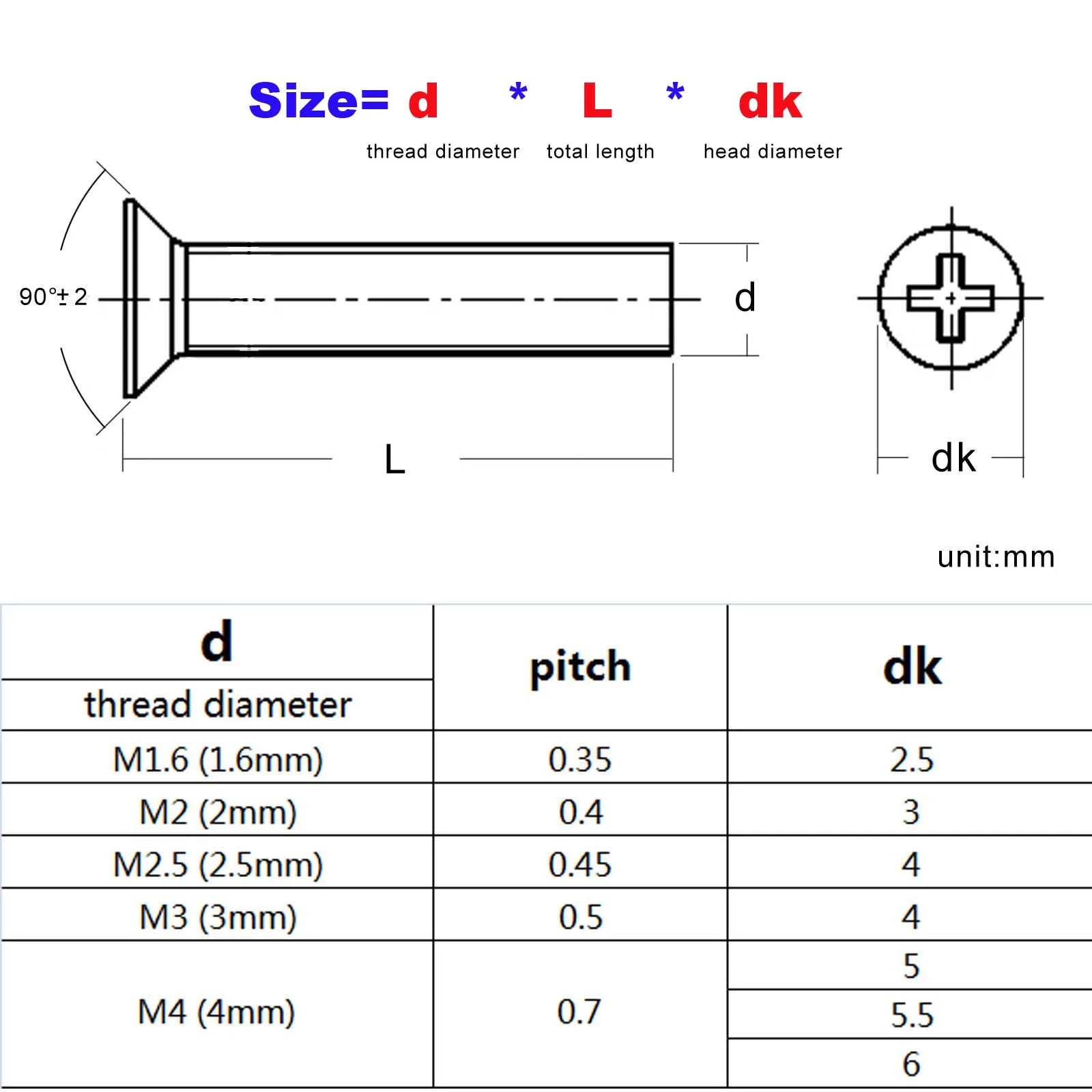 Material304(A2-70) stainless steelSized(thread diameter)xL(total length) xdk(head diameter)Thread diameterM1.6(1.6mm) / M2(2mm) / M2.5(2.5mm) / M3 (3mm) / M4(4mm)Thread pitch0.45mm(M2.5) / 0.5mm(M3)Head diameter2.5mm / 3mm / 4mm / 5mm / 5.5mm / 6mm