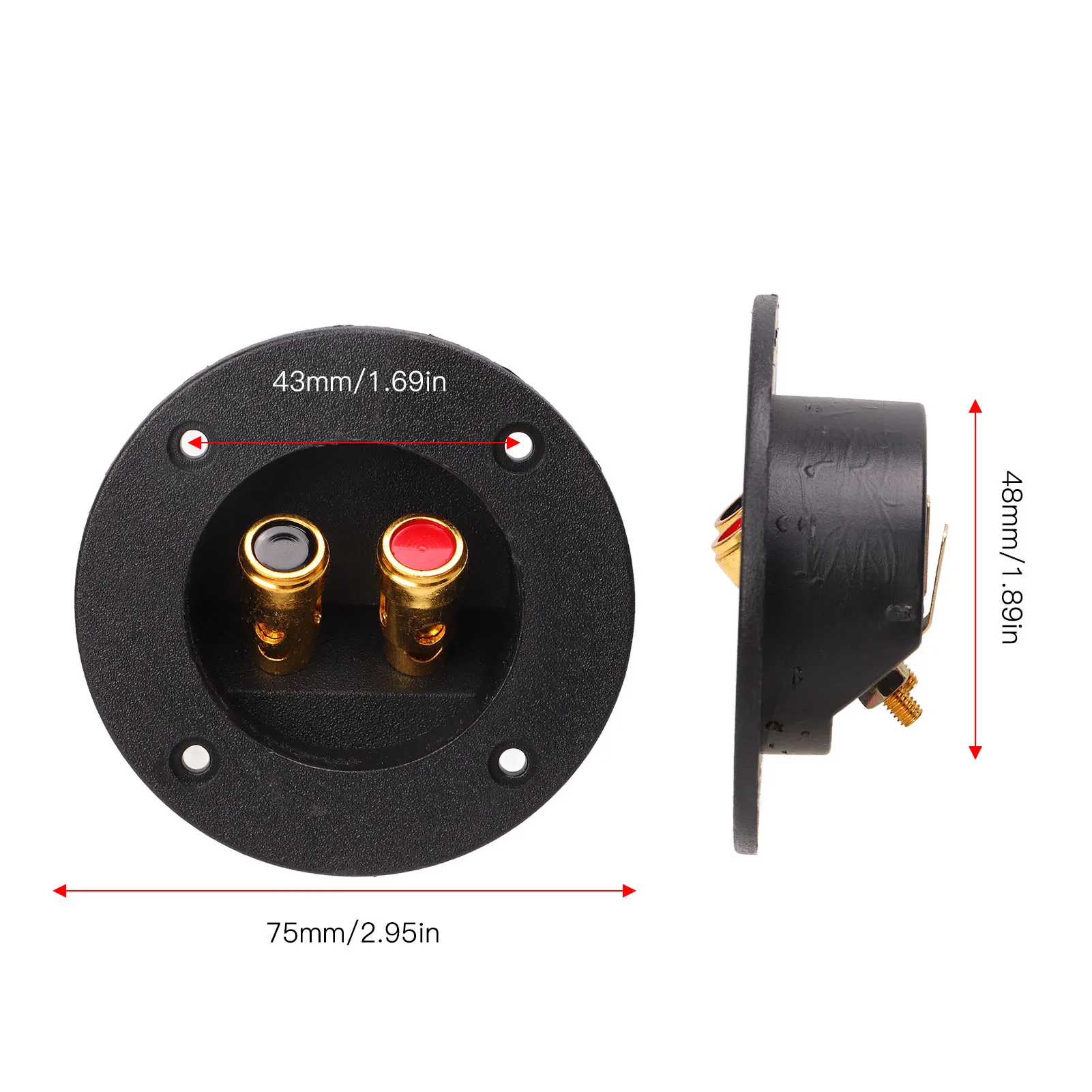 Features 1、Designed for DIY: Speaker subwoofer box terminal cup works with banana plugs, or bare wires. Perfect for use in the home, hotel, hall or wherever you want to set up your speakers. 2、Durable Construction: The speaker box is made of ABS plastic and zinc alloy and can be used for a long time. It has a good seal and won't damage your speakers. 3、Easy Connection: This round terminal cup features dual binding post terminals for easy connection of speaker wires to speakers or subwoofer enclosures. 4、Simple Installation: Metal contacts allow for optimal signal transmission and terminals ensure a secure connection. It's easy to install, screw locked, and easy to use. 5、Dimensions: Round speaker terminal box. The outer diameter is 75mm/2.95in, the inner diameter is 48mm/1.89in, and the distance between the screw mounting holes is 43mm/1.69in.