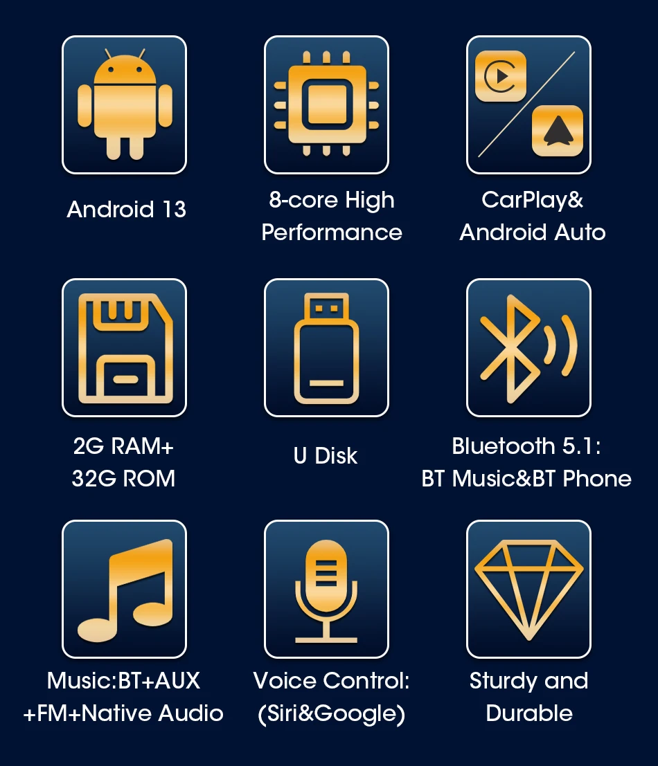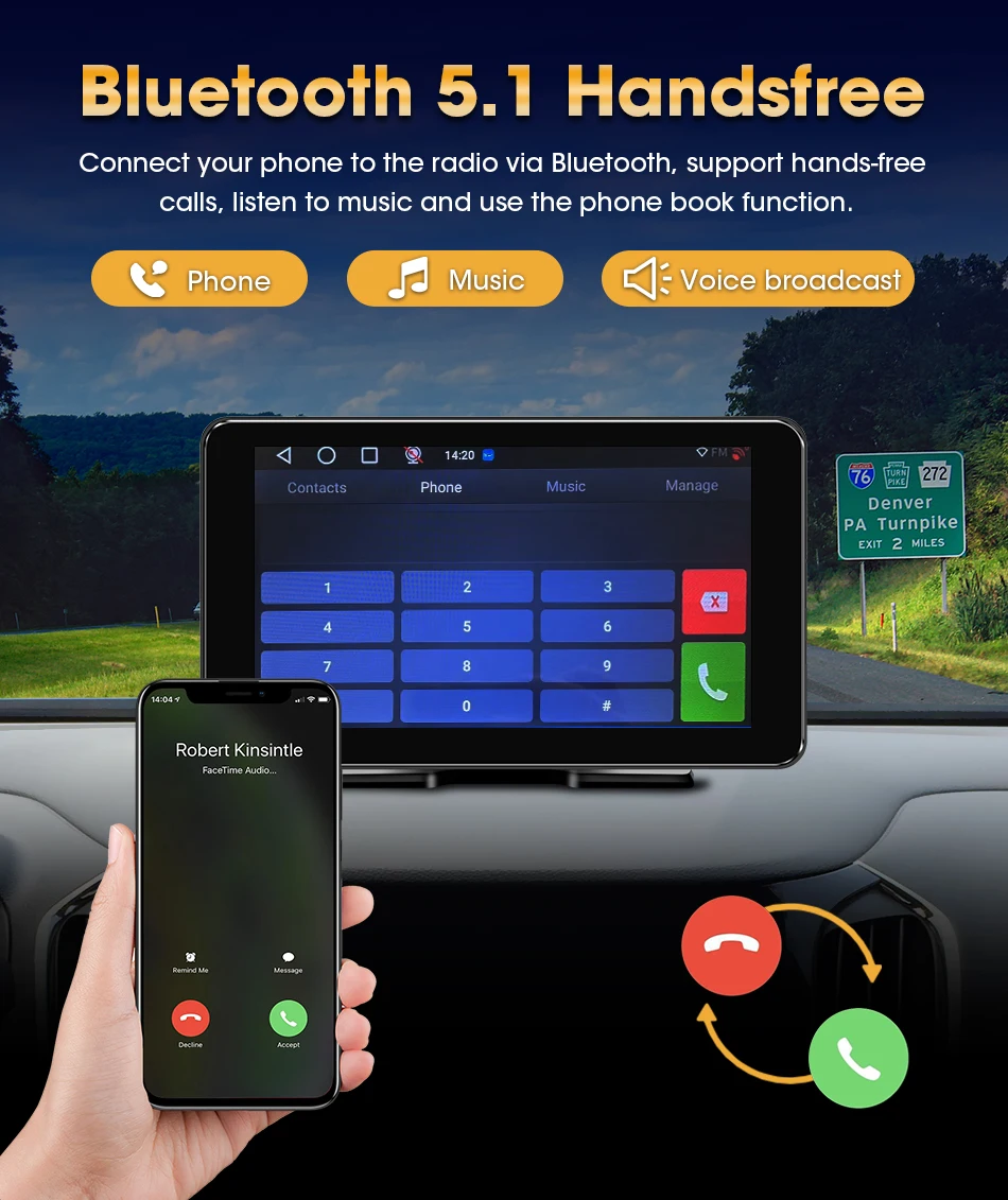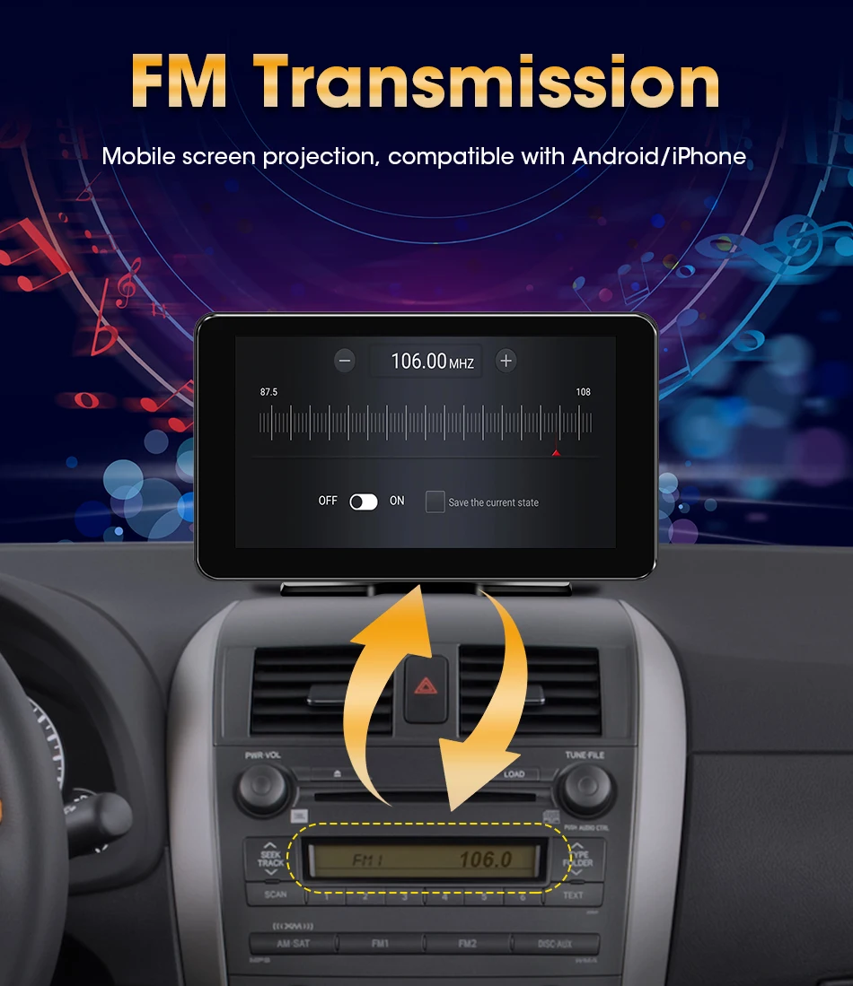 【Stable Bluetooth&FM&AUX】This 7" wireless carplay screen has built-in speakers. In addition, you can also achieve hands-free calling and audio streaming through Bluetooth connection, making driving safer and more convenient. Meanwhile, the carplay screen supports FM and AUX audio transmission. You only need to set the same frequency on the device and car radio, or connect it to the original auxiliary interface on the car using an AUX cable to achieve a lossless sound quality experience.
