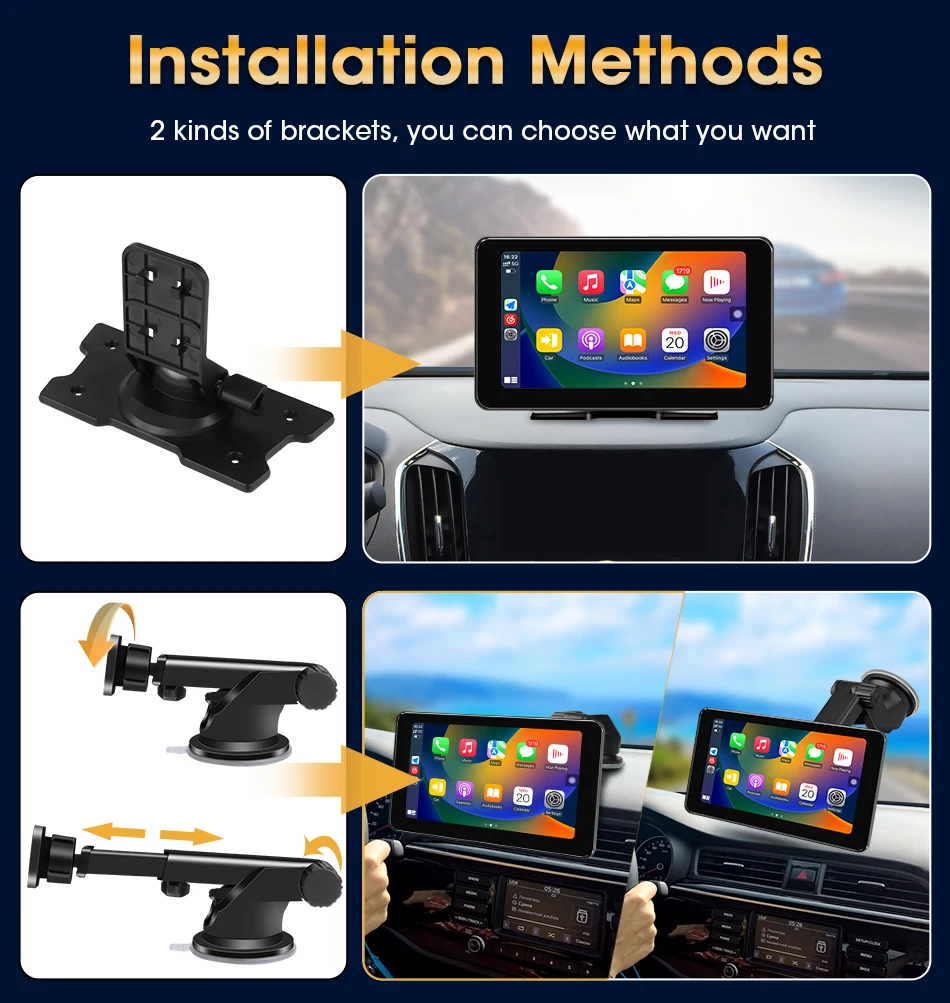 【Flexible Installation & Wide Compatibility】Our car touch screen is equipped with adjustable suction brackets and self-adhesive instrument panel brackets,no need for special tools or dismantling the original equipment of the car, saving you time and cost while avoiding the risk of damaging the car. In addition, the portable carplay screen is powered by a 12-32V DC cigarette lighter and is suitable for almost all types of cars, taxis, trucks, caravans, trucks, and campers.