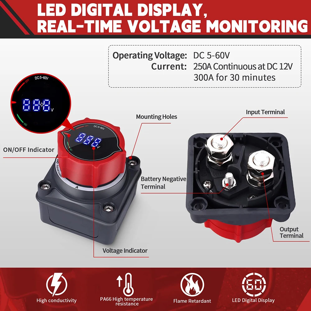 Operating Voltage 5-60 Volts DC Current 250A Continuous at DC 12V, 300A for 30 minutes Resolustion 0.1V Accuracy 1%+2digitals Terminal Material Silver-Plated Copper 2 Positions ON/OFF Operating Temperature -40°C--80°C Operating Humidity <90%