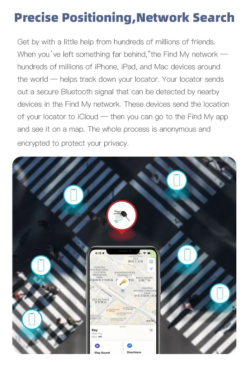 *Accessibility: Record lost location, Rename Item, Customize item icon. * Keep tracking and find your items alongside friends and devices in the Find My app (only IOS). * Simple one-tap setup instantly connects Tag with your Phone or Pad (not for android). * Play a sound on the built-in speaker to help find your things. * Precision Finding locator leads you right to your nearby the tracking Tag. * Find items further away with the help of hundreds of millions in the Find My network. * Put smart tag into Lost Mode to be automatically notified when it’s detected in the Find My network. * All communication with the Find My network is anonymous and encrypted for privacy, Location data and history are never stored on Tag. * Replaceable battery lasts over a year. * Use APP: IOS Find My (IOS 14.5 or later) * Battery: Built-in battery(Replaceable)