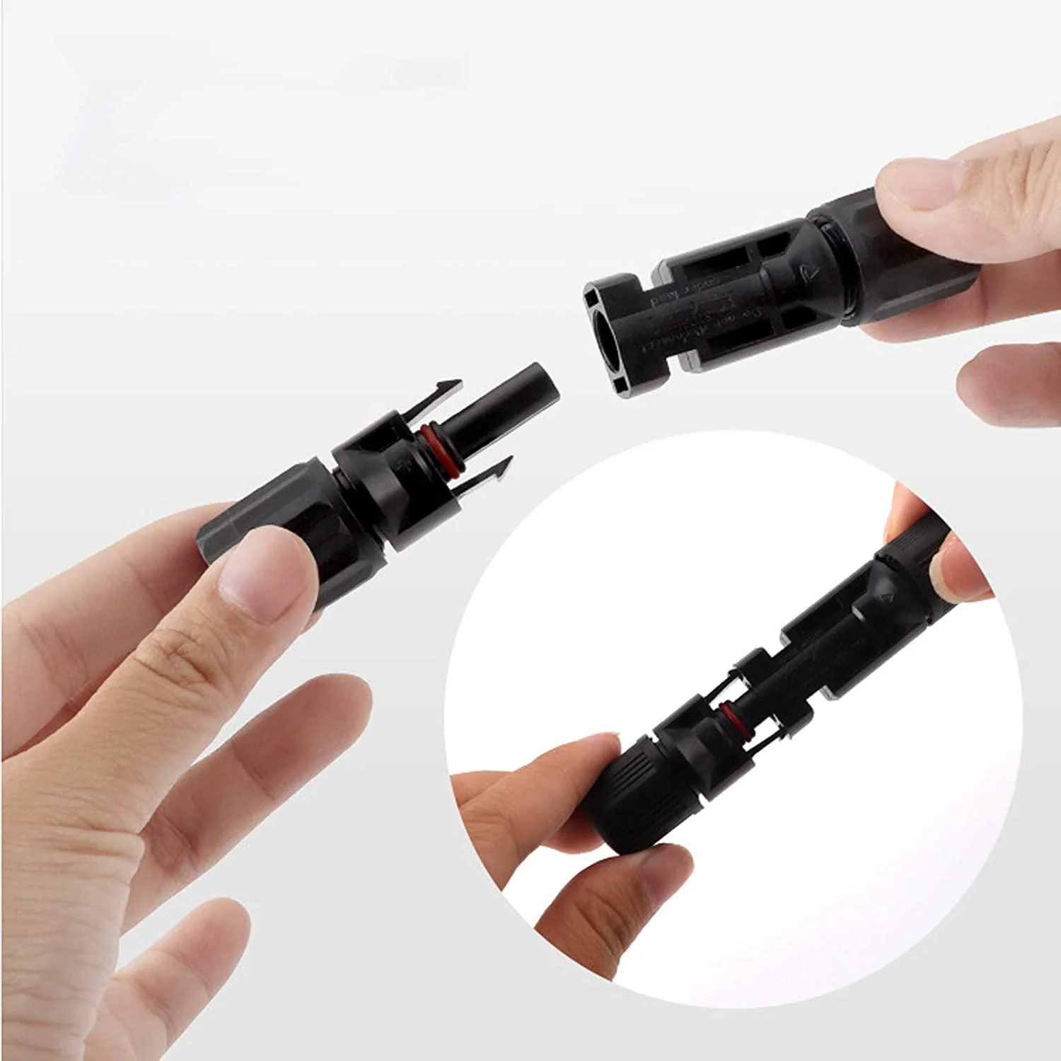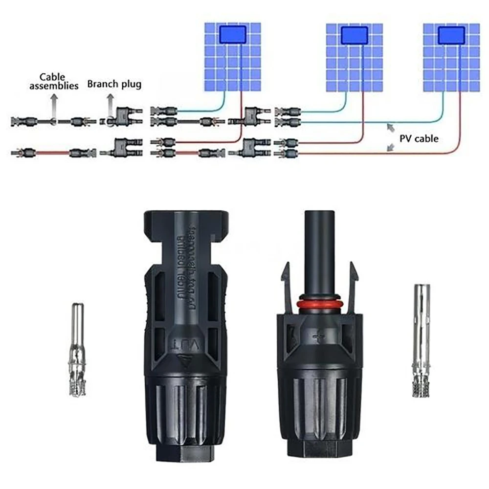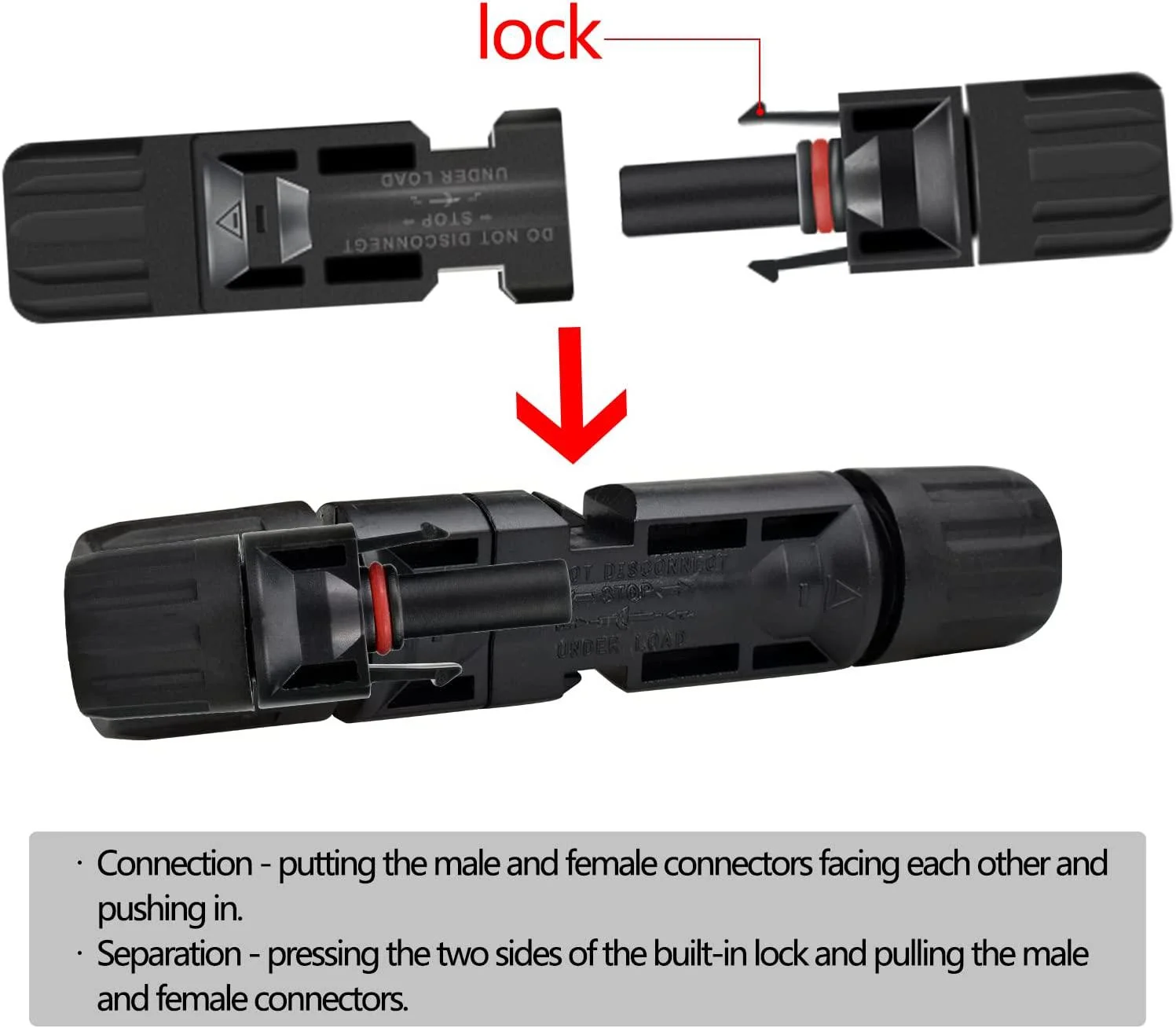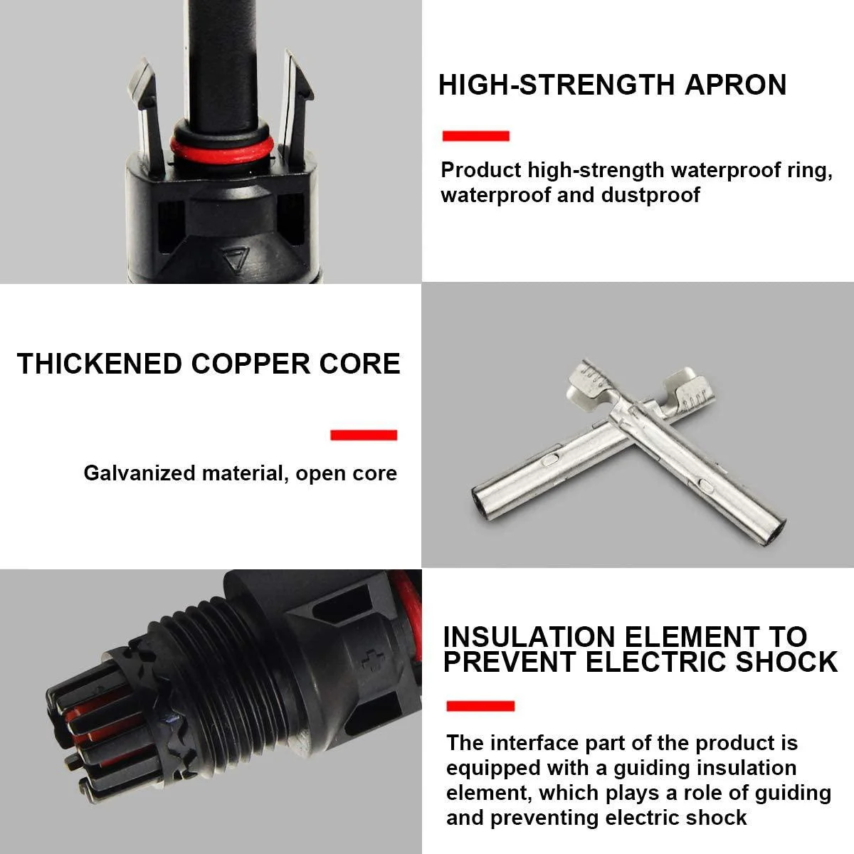 (Ⅱ) WIDE COMPATIBILITY: THE CONNECTOR CONTACT IS MADE OF COPPER WITH SILVER PLATED FOR STABLE CONNECTION, RATED CURRENT 30A, VOLTAGE 1000V DC. THEY ARE APPLICABLE TO DIFFERENT DIAMETER SOLAR CABLE FROM 2.5MM²/4MM²/6MM² (14AWG-10AWG).