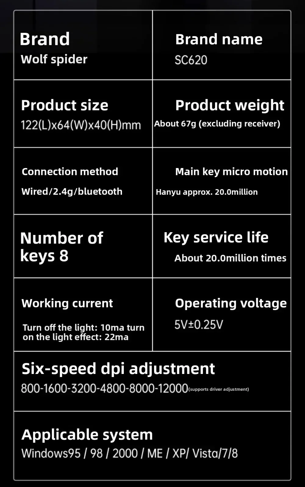 Dpi:Adjustable, ≤ 800, 1200, 3200, 8000, 12000