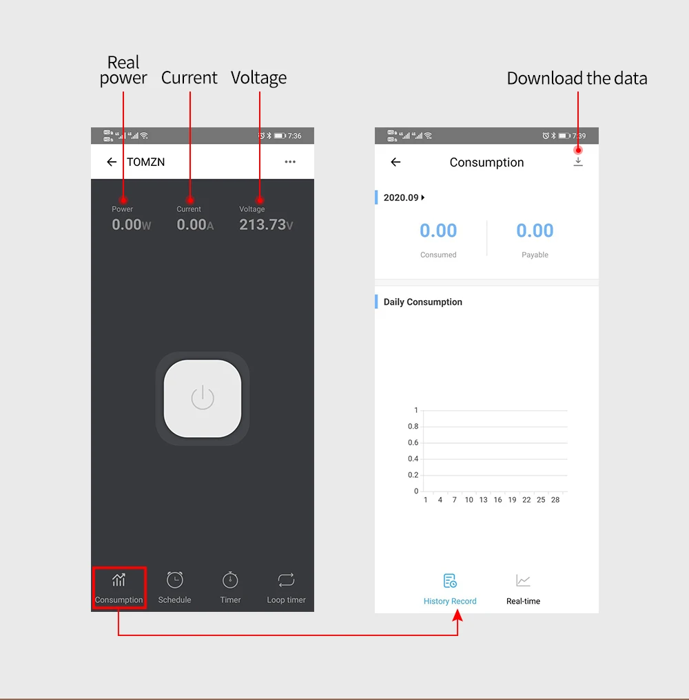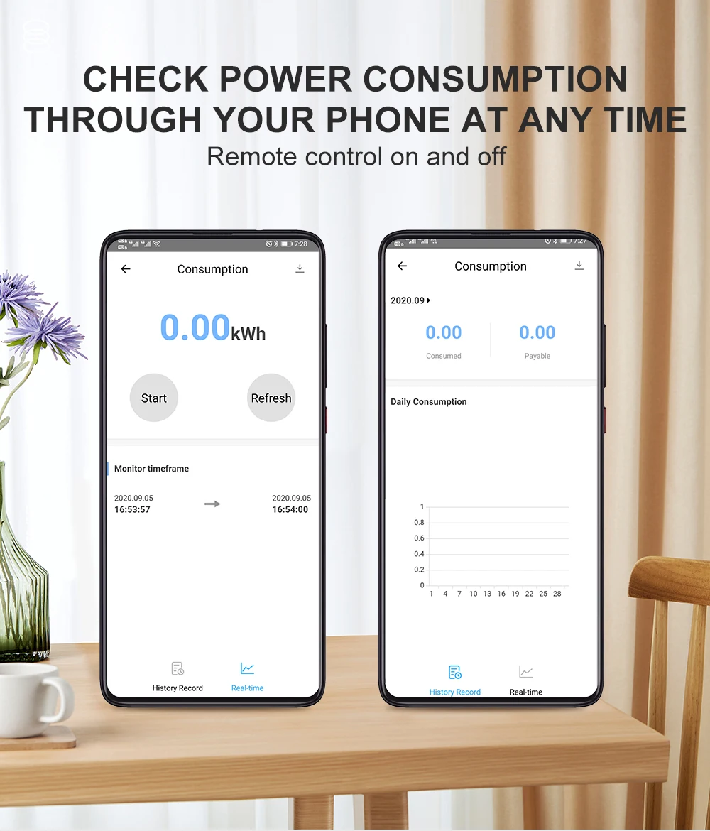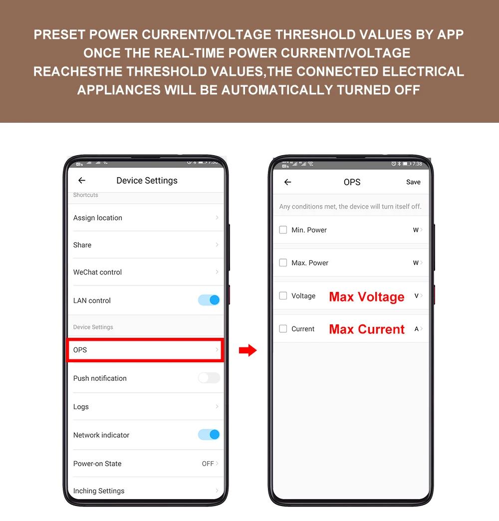 4.Preset power/current/voltage threshold values by app, Once the real-time power/current/voltage reaches the threshold values, The connected electrical appliances will be automatically turned off