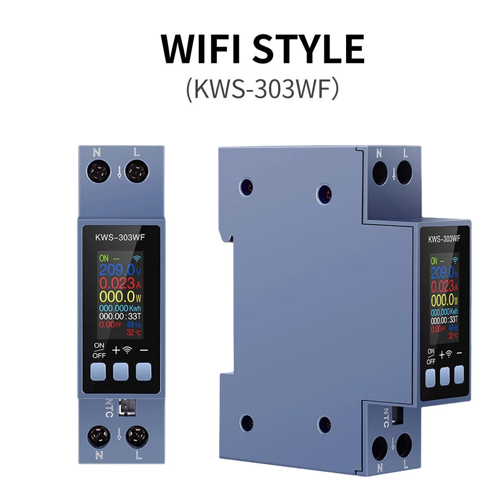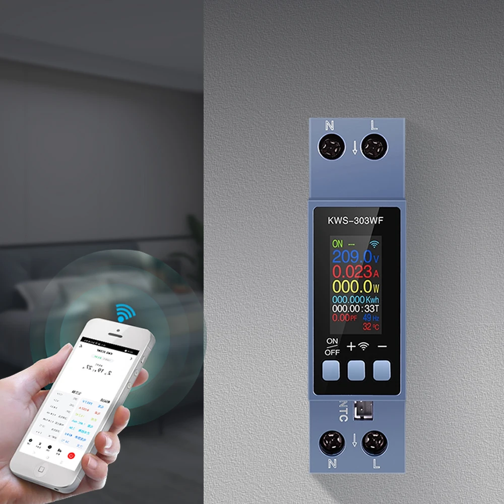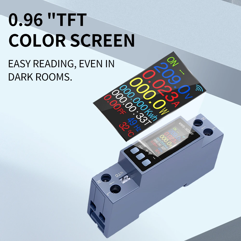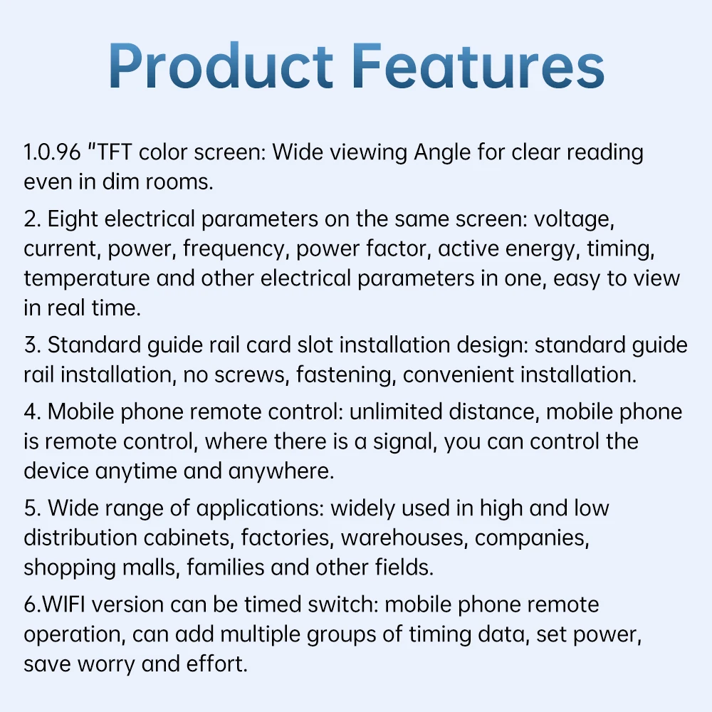 Features: 1.0.96-inch TFT color screen: wide viewing angle, even in a dim room, you can read clearly. 2.8 electric parameters on the same screen: set voltage, current, power, frequency, power factor, active energy, timing, temperature and other electric parameters in one, convenient for real-time viewing. 3. Standard rail slot mounting design: standard rail mounting, no screws, snap fastening, convenient and easy to install. 4. Mobile phone remote control: unlimited distance, cell phone is the remote control, where there is a signal you can control the device anytime, anywhere. 5. Wide range of applications: widely used in high and low power distribution cabinets, factories, warehouses, companies, shopping malls, family home and other fields. 6.WIFI version can be timed switch: cell phone remote operation, you can add multiple sets of timed data, set the power on and off, saving energy.