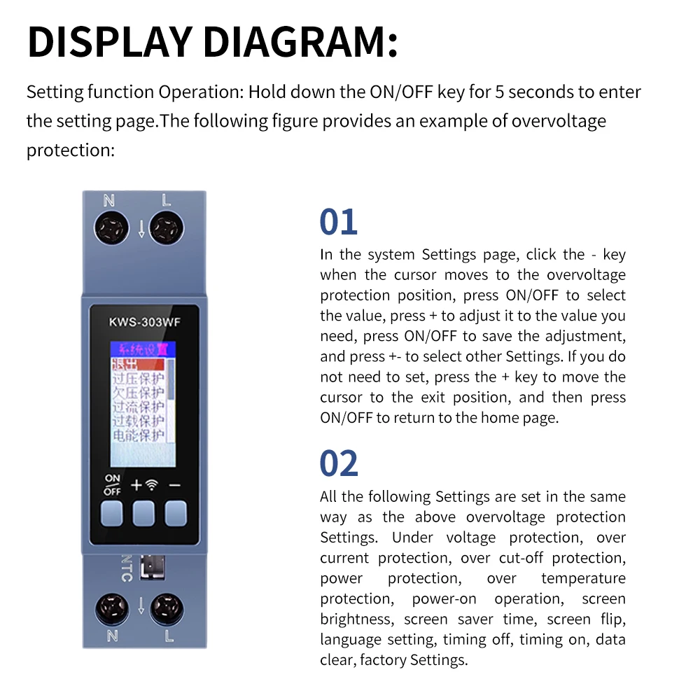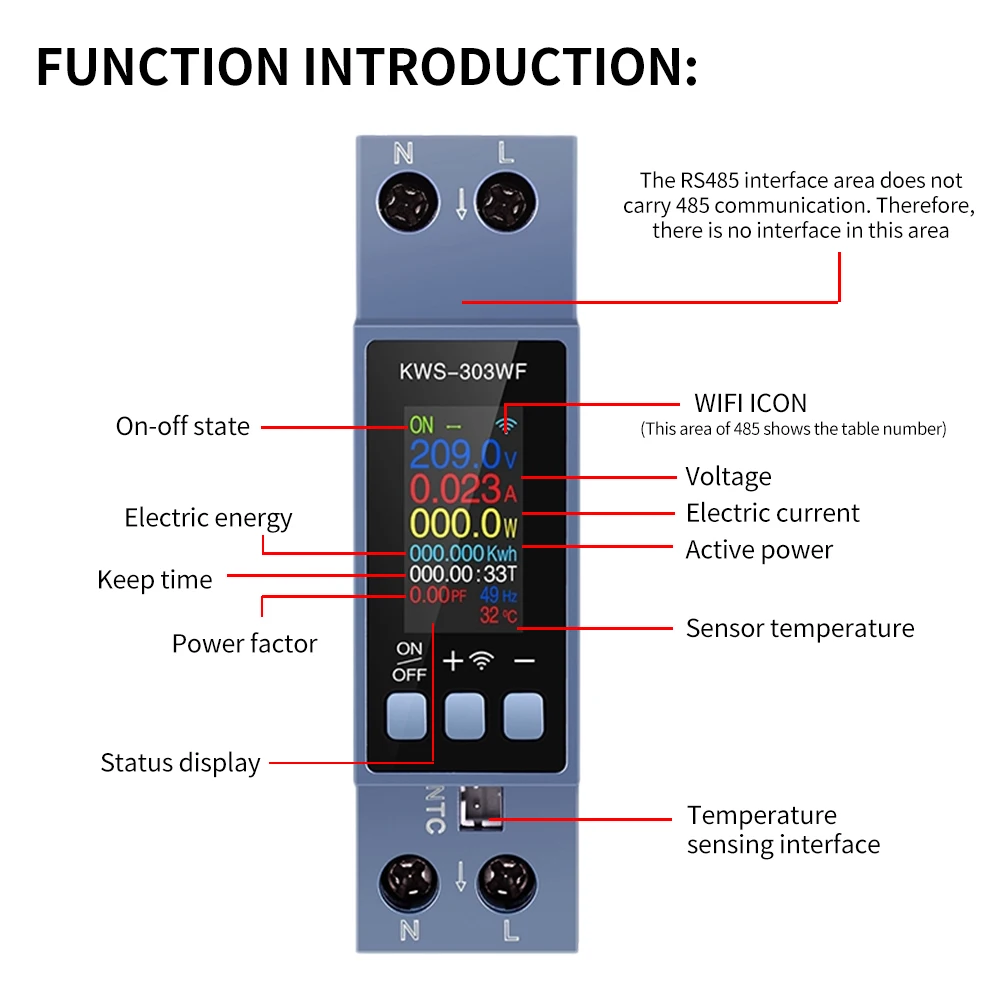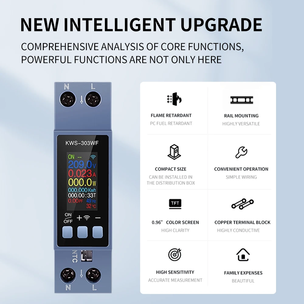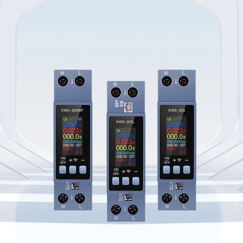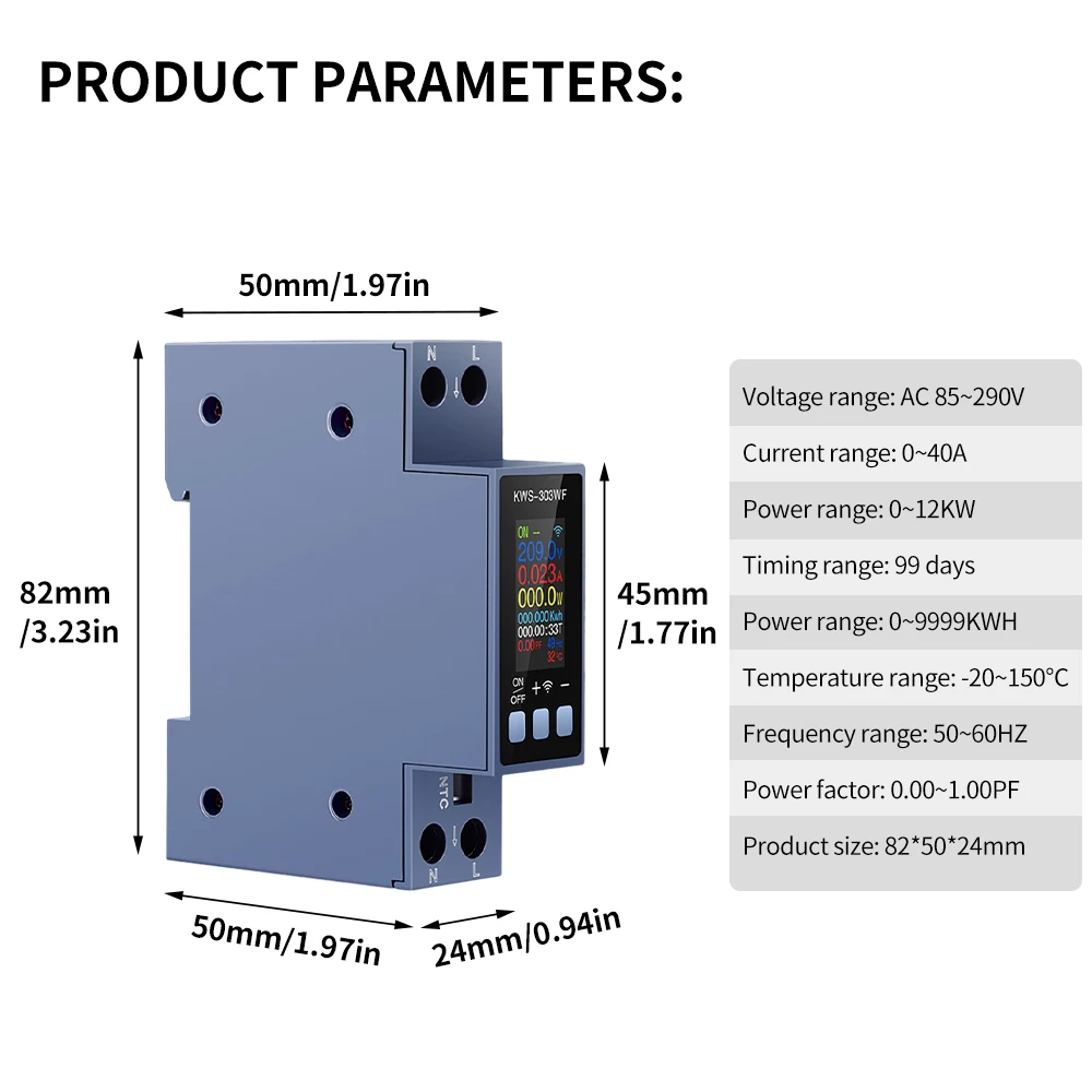 Features: 1.0.96-inch TFT color screen: wide viewing angle, even in a dim room, you can read clearly. 2.8 electric parameters on the same screen: set voltage, current, power, frequency, power factor, active energy, timing, temperature and other electric parameters in one, convenient for real-time viewing. 3. Standard rail slot mounting design: standard rail mounting, no screws, snap fastening, convenient and easy to install. 4. Mobile phone remote control: unlimited distance, cell phone is the remote control, where there is a signal you can control the device anytime, anywhere. 5. Wide range of applications: widely used in high and low power distribution cabinets, factories, warehouses, companies, shopping malls, family home and other fields. 6.WIFI version can be timed switch: cell phone remote operation, you can add multiple sets of timed data, set the power on and off, saving energy.
