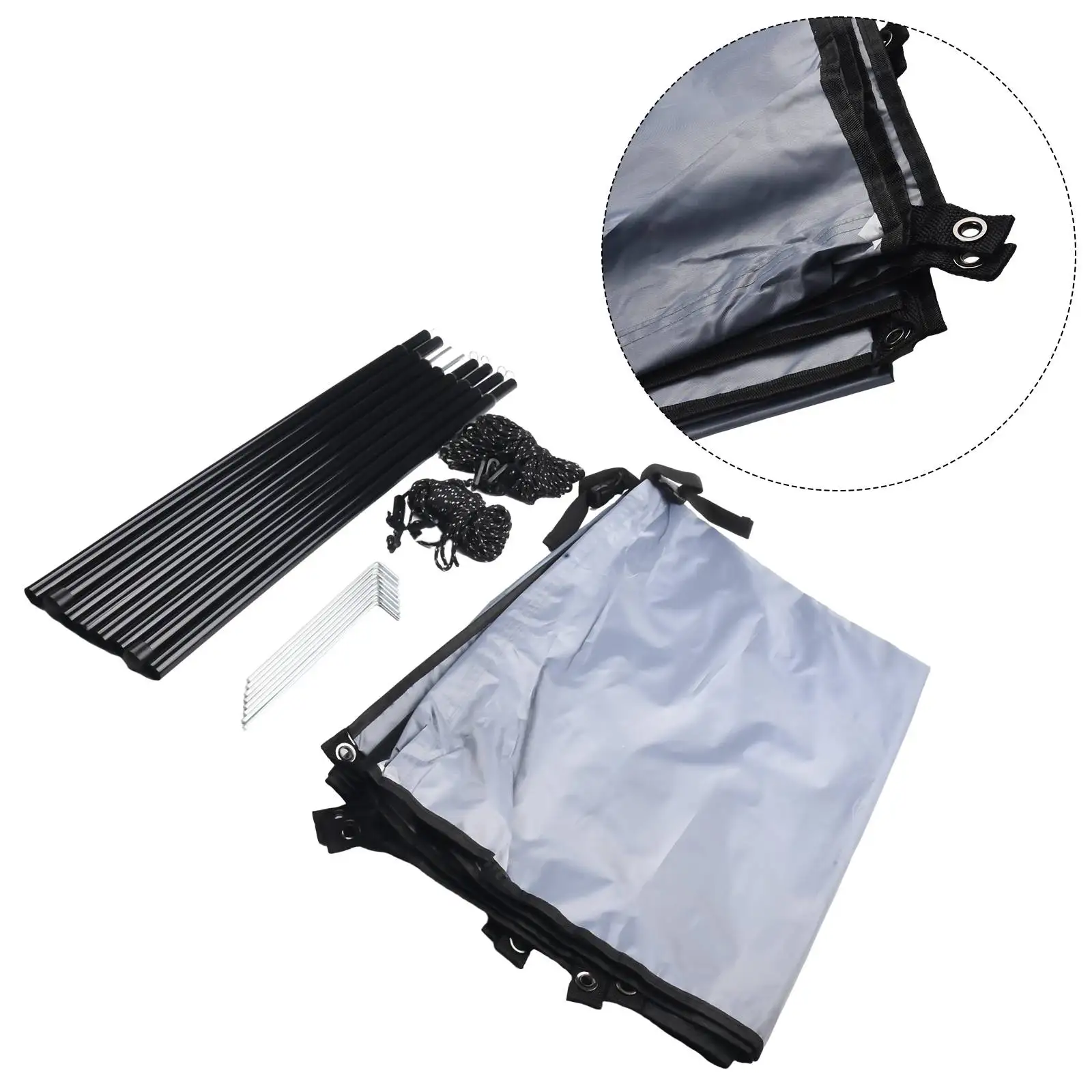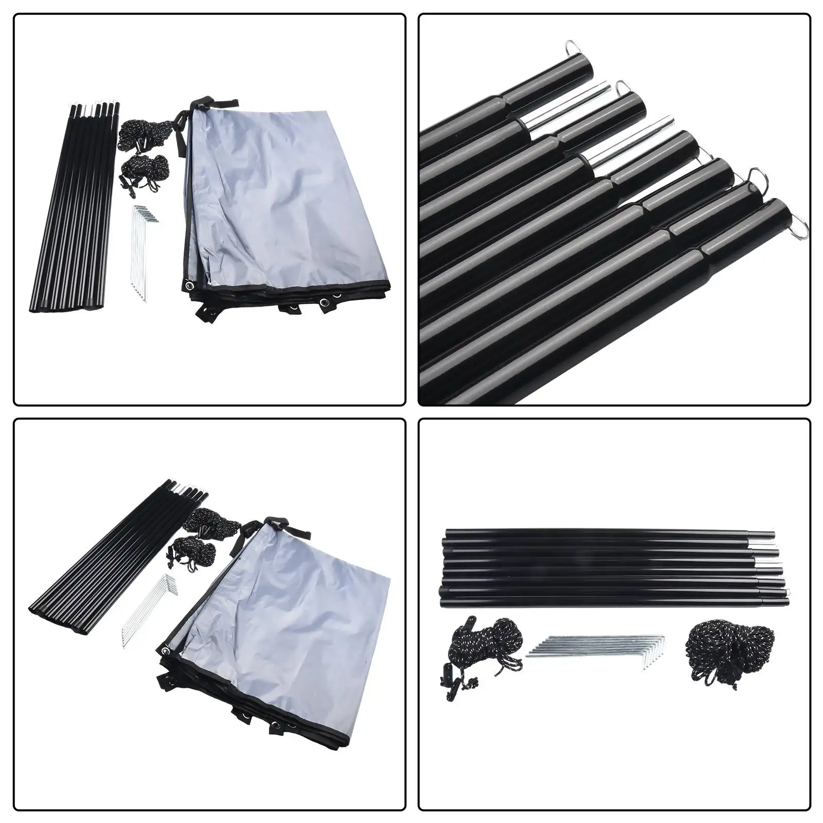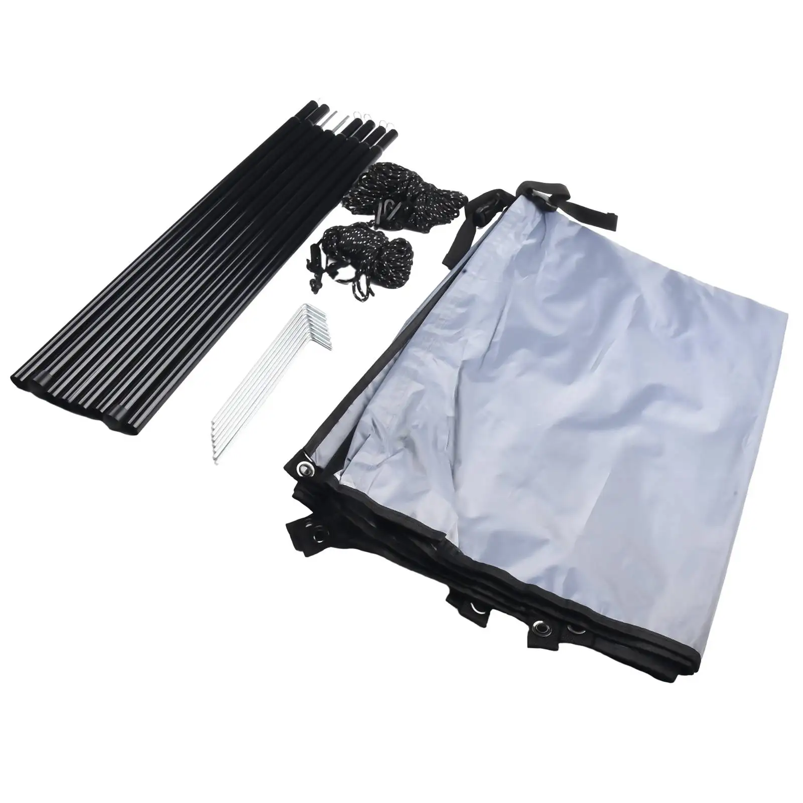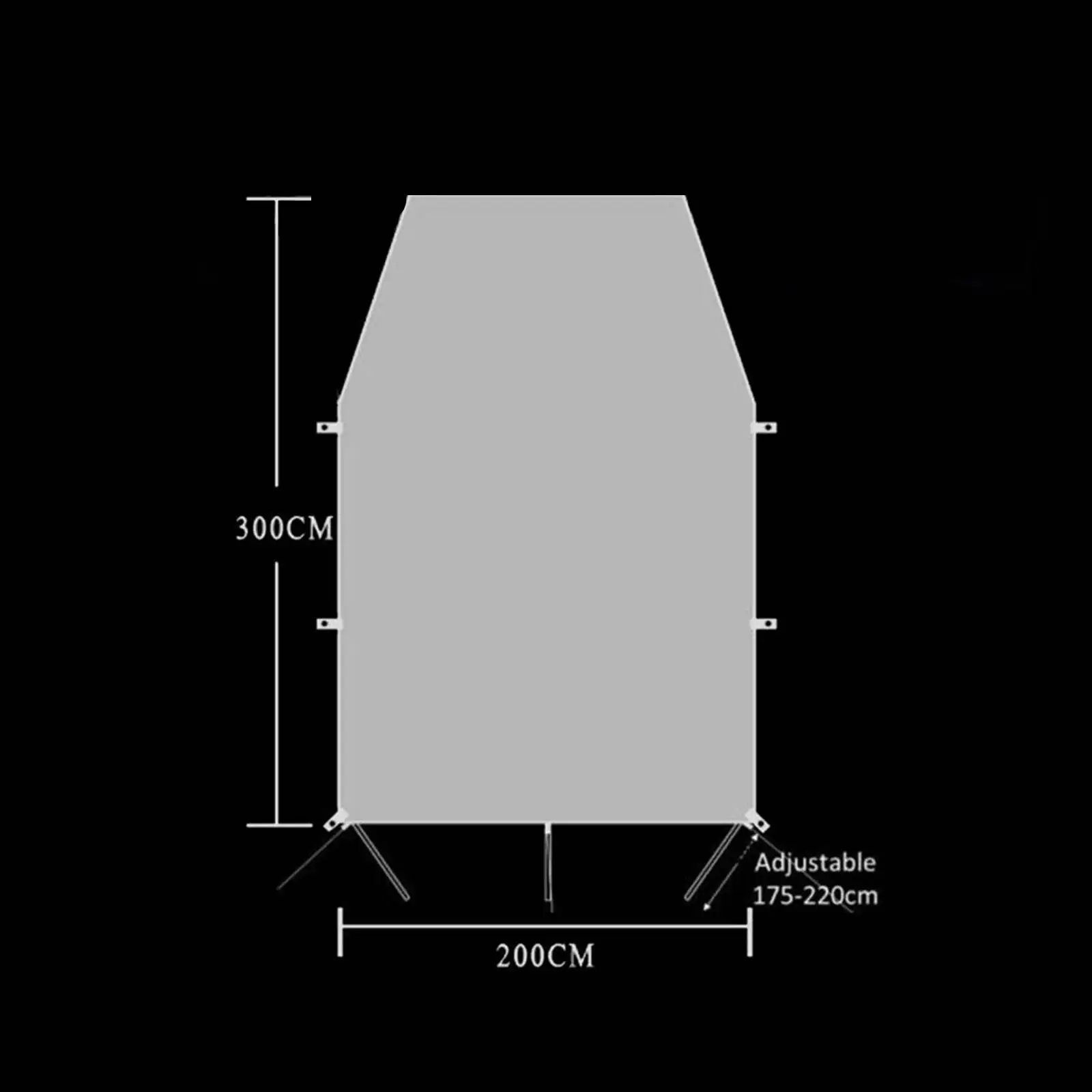 The canopy is 100cm wide at the vehicle for edge, 300cm deep and 150cm along the front making it of the largest waterproof sun canopy awnings on the market. This unique three pole design with strong 210D fire retardant fabric will for stand up to most weather conditions and can also be set-up as a freestanding shelter.