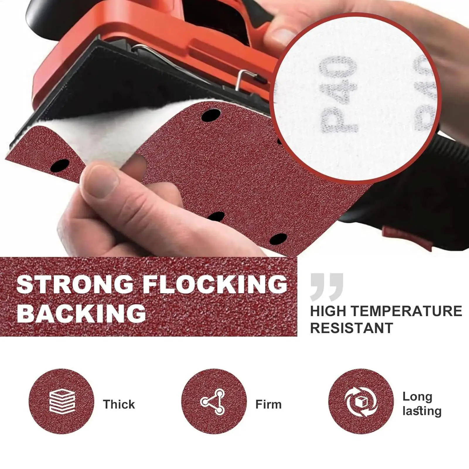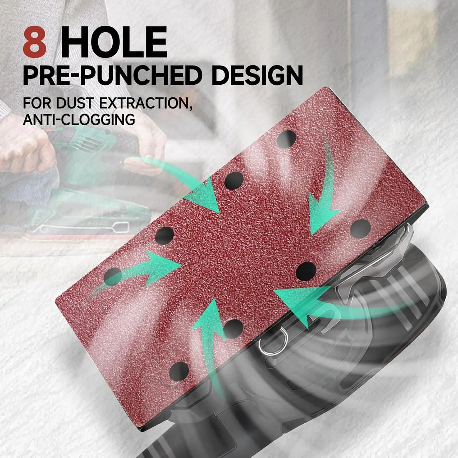 5.No Clogging Advantage: Engineered with a reduced clogging design and 8-hole dust extraction to prevent clogging, maintaining optimal air flowing while enabling efficient debris clearance and compatibility with standard sander sheet sizes