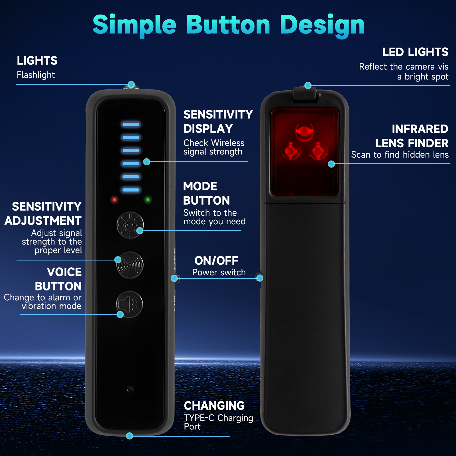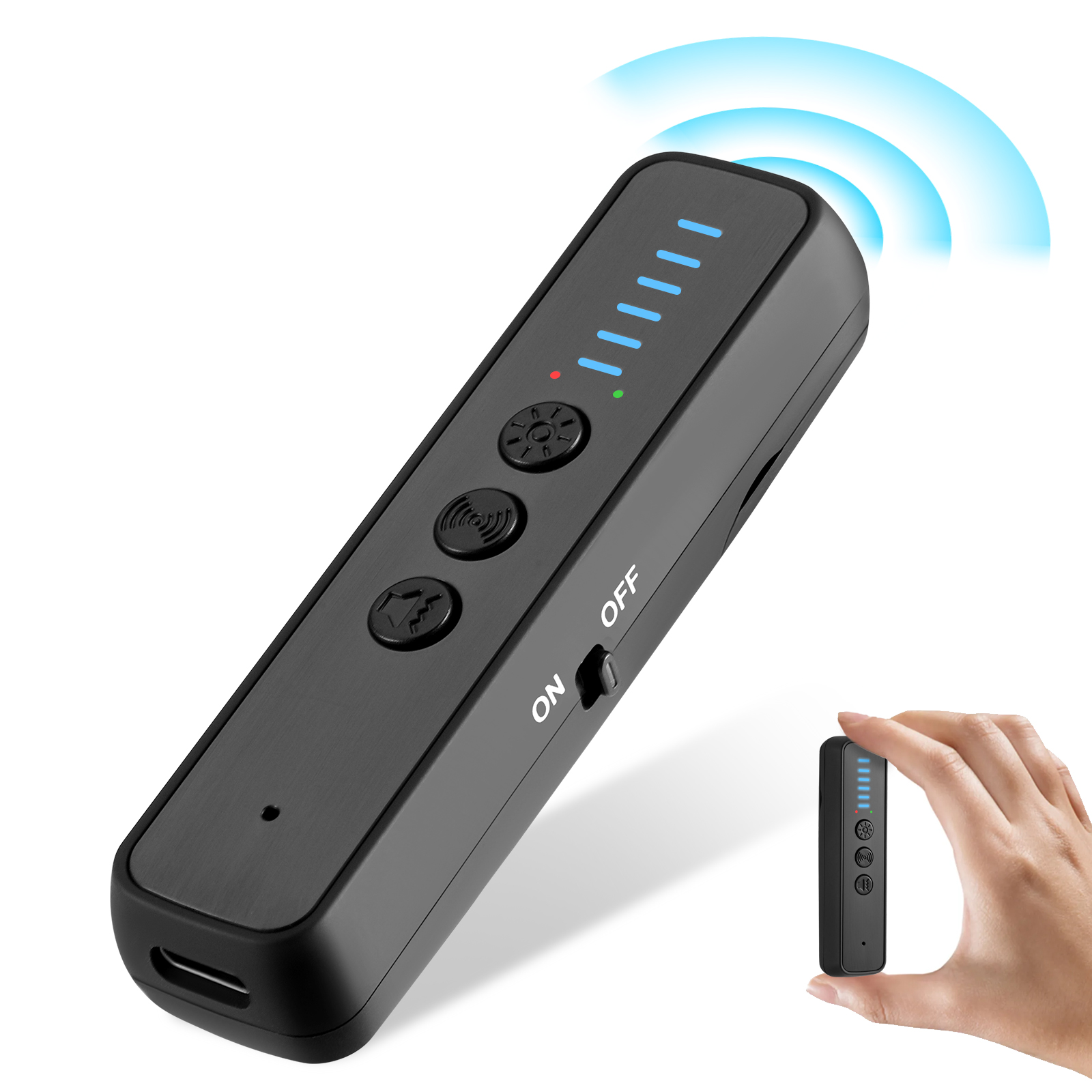 5.【Easy to Use】 The hidden camera detector is easy to use! You can push the power switch on the side of the detector to turn on the item,and press the "mode button" and "sensitivity adjustment button", You can switch between various functions at will. You don't need to worry about cumbersome operations, even novices can quickly master how to use the product.You can experience the fun of simplicity and ease of use!