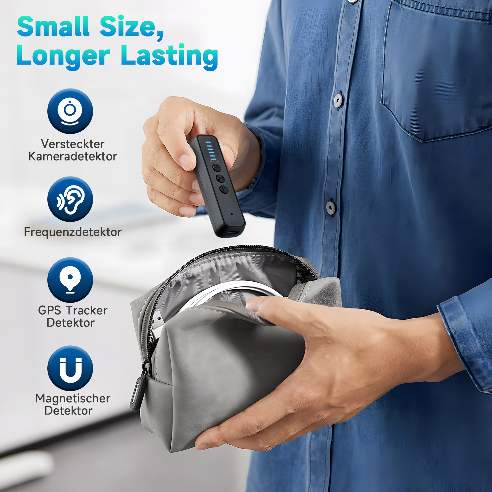 4.【Low-key Portable Design and Long Working Hours】This anti spy camera detector has stylish unique appearance like a pen, the size is quite small perfect for carrying around. The bug detector is equipped with a Lithium Ion rechargeable battery,you can easily keep it continuously working for over 5 hours after full charging. Standby time over 24 hours (the length of time depends on the use mode) .