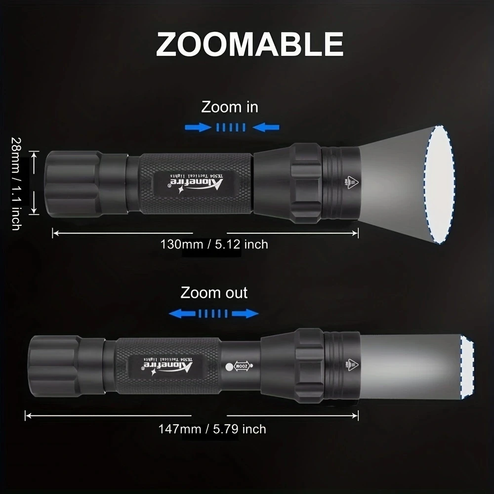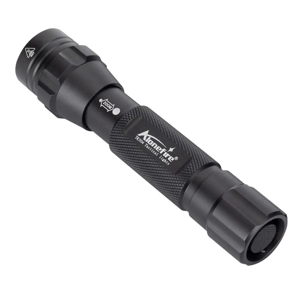 Specifications: 1. Brand: Alonefire 2. Product model: TK504(Zoom flashlight) 3. Material: Aircraft aluminum alloy 4. LED: Vcsel 850nm or 940nm led 5. Battery: for 1 x 18650 rechargeable battery 6. voltage: 3.7-4.2V 7. Waterproof: Splash proof only 8. Dimensions: 130mm / 5.12 inch(length) x 30mm / 1.18 inch(head) x 28mm / 1.10 inch(Tail) 9. Weight: 103g / 0.23 Lb
