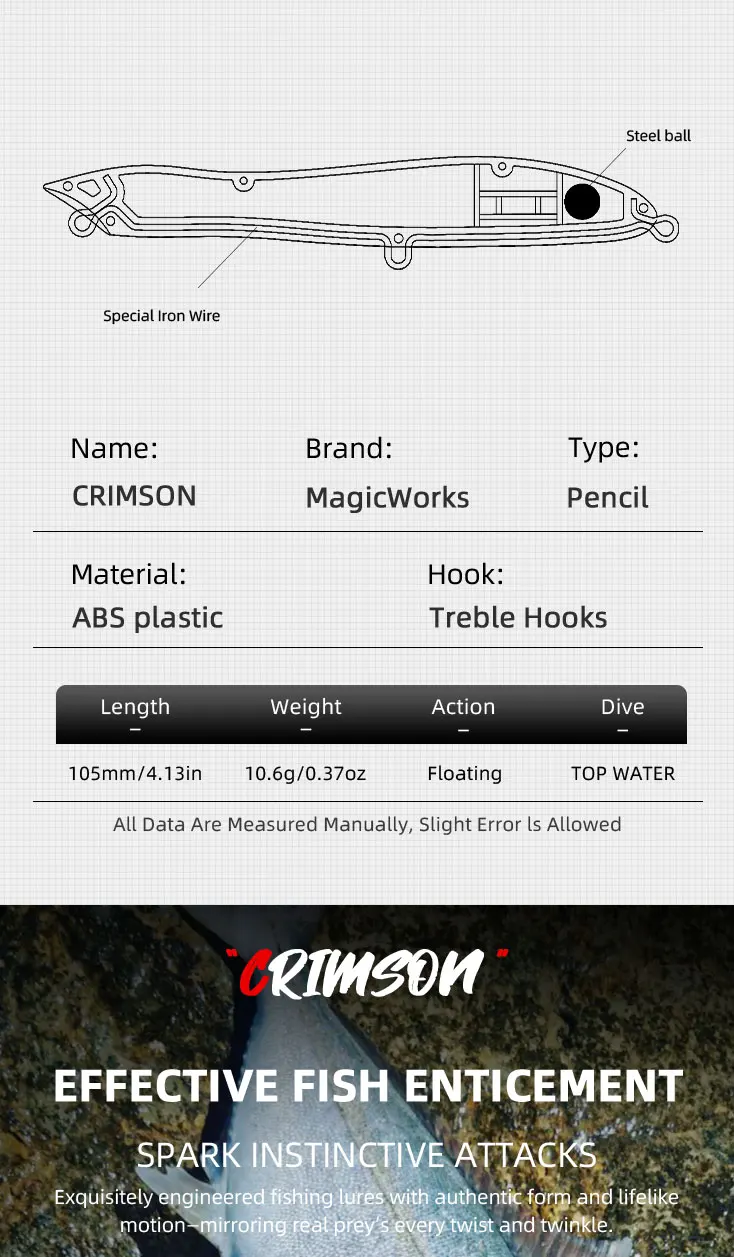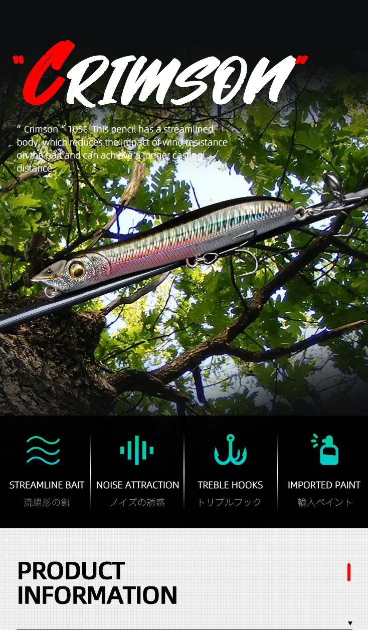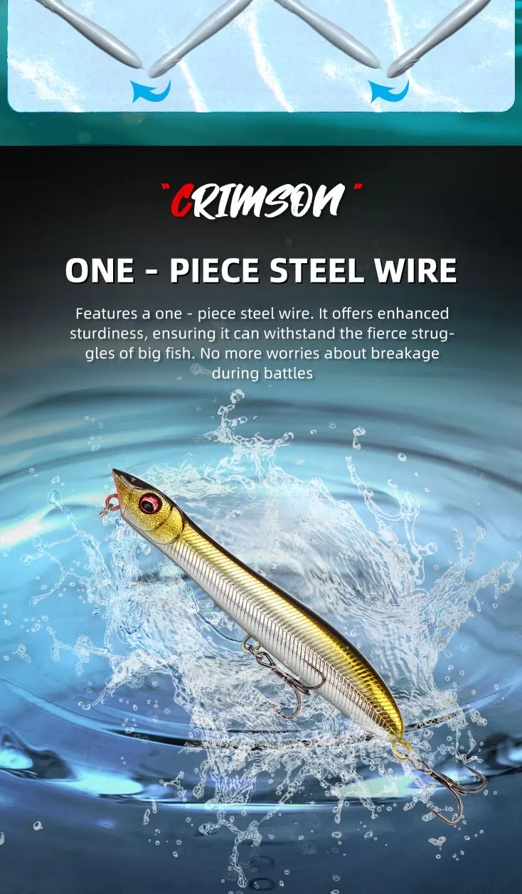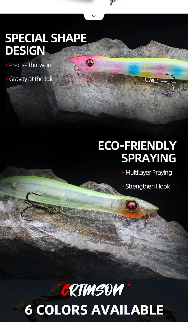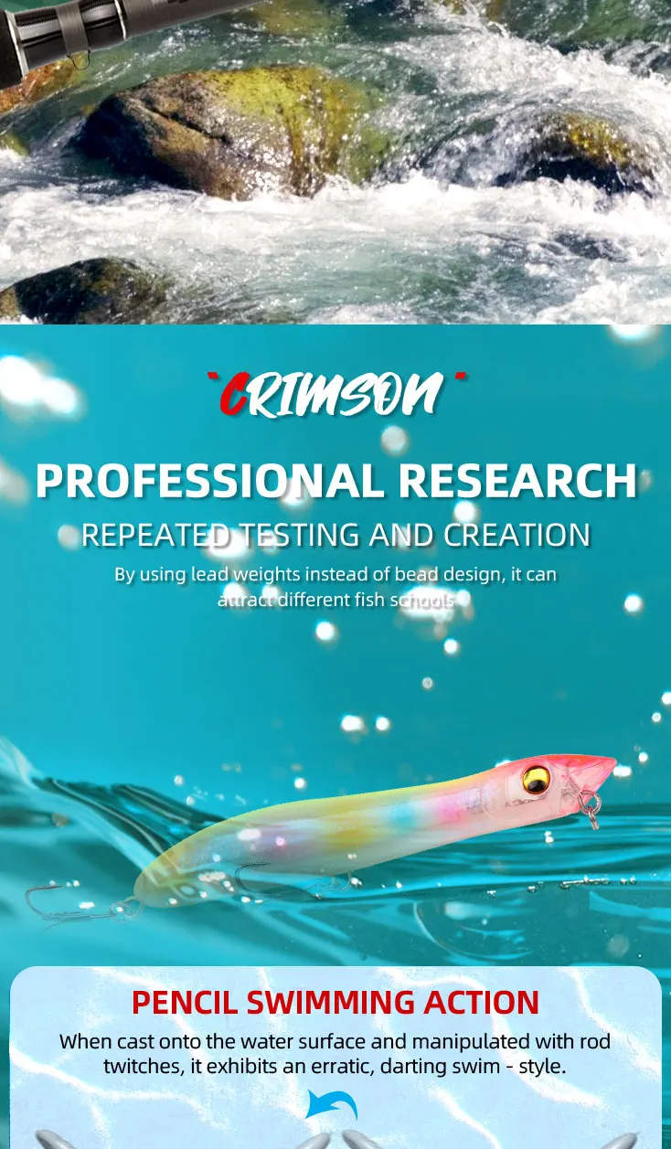 1.This pencil has a streamlined body, which reduces the impact of wind resistance on the bait and can achieve a longer casting distance.