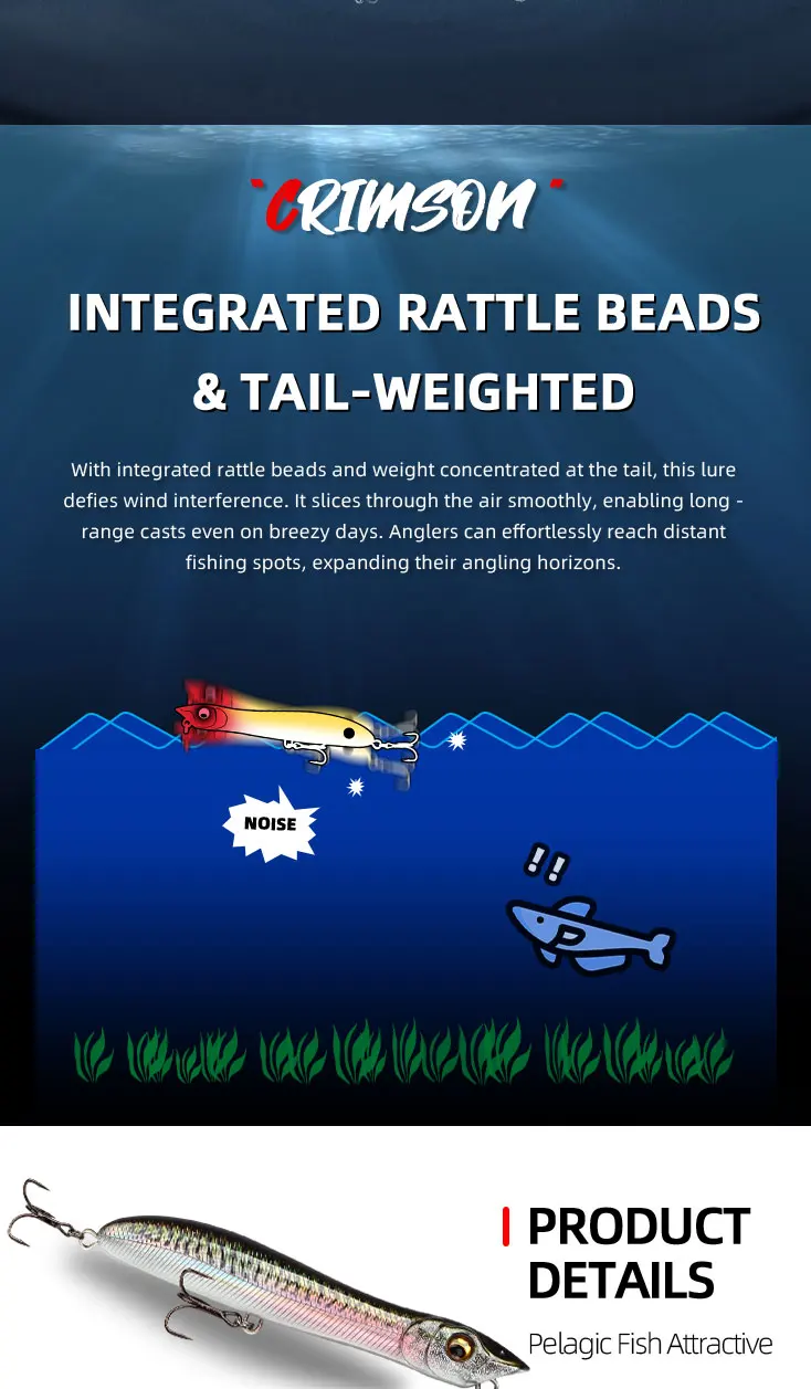 5.With integrated rattle beads and weight concentrated at the tail, this lure defies wind interference. it slices through the air smoothly, enabling long-range casts even on breezy days. Anglers can effortlessly reach distantfishing spots, expanding their angling horizons.