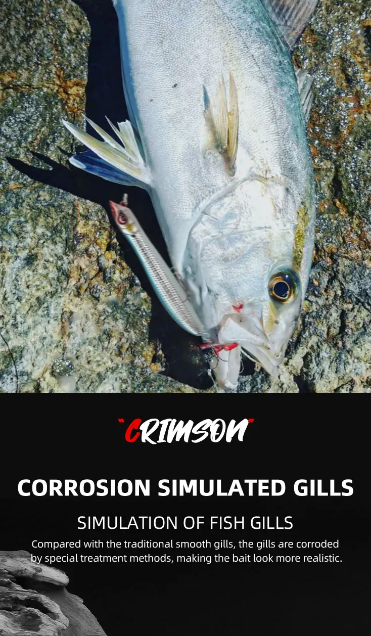 2.Compared with the traditional smooth gills, the gills are corroded by special treatment methods, making the bait look more realistic.