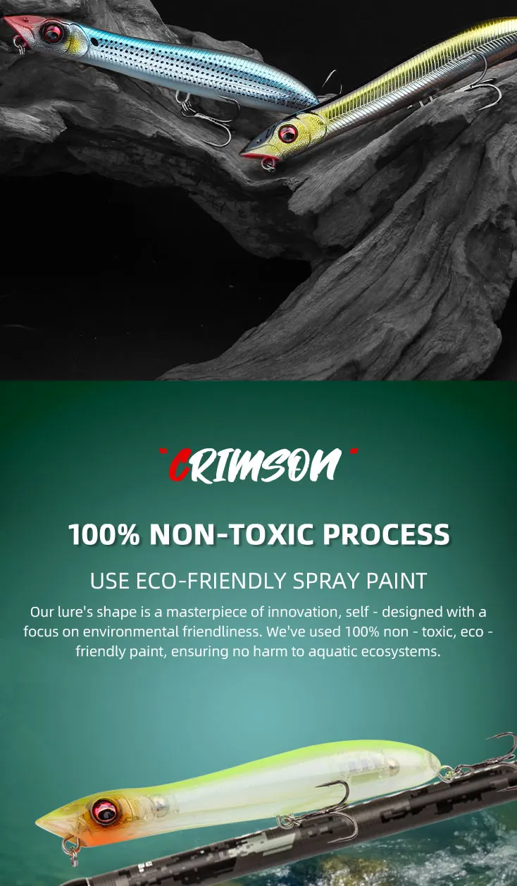 3.Our lure's shape is a masterpiece of innovation, self- designed with afocus on environmental friendliness. We've used 100% non - toxic, eco-friendly paint, ensuring no harm to aquatic ecosystems.