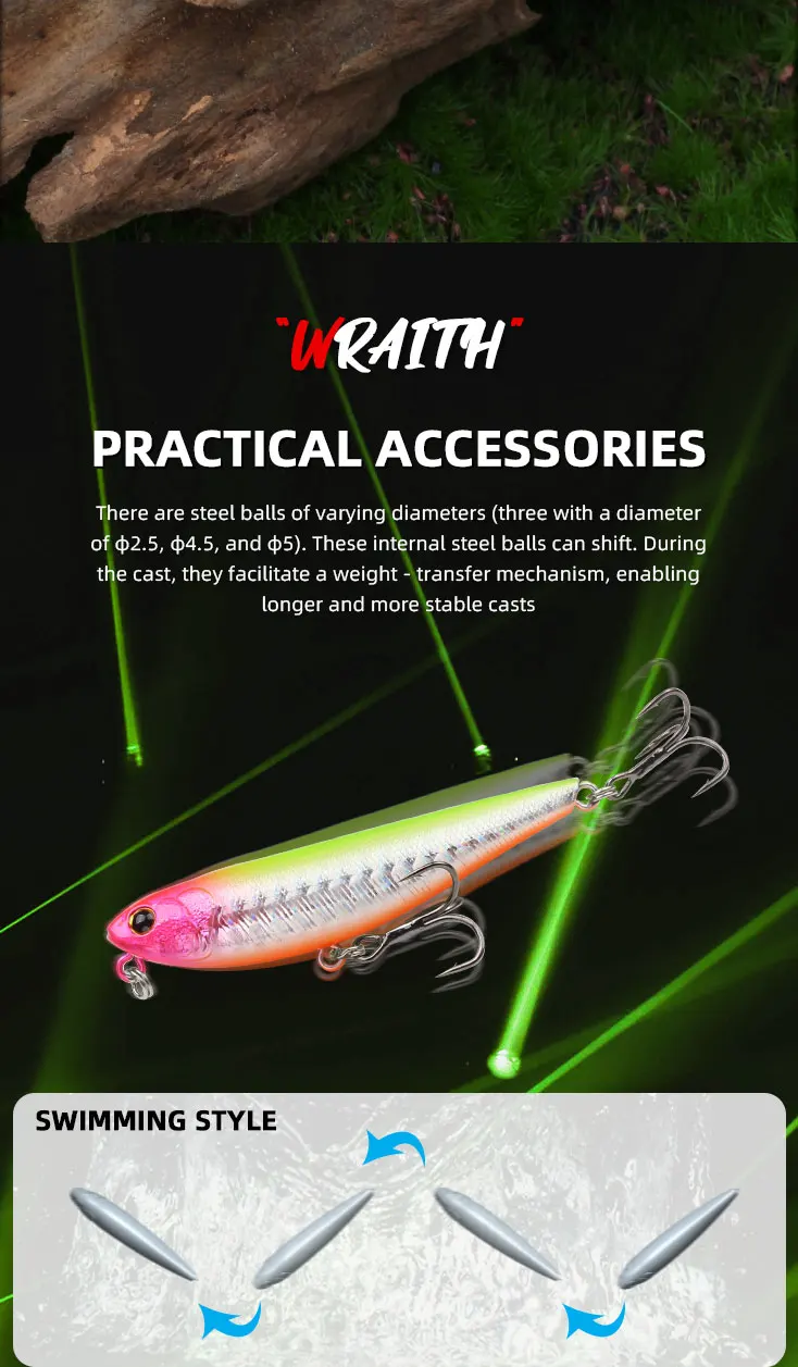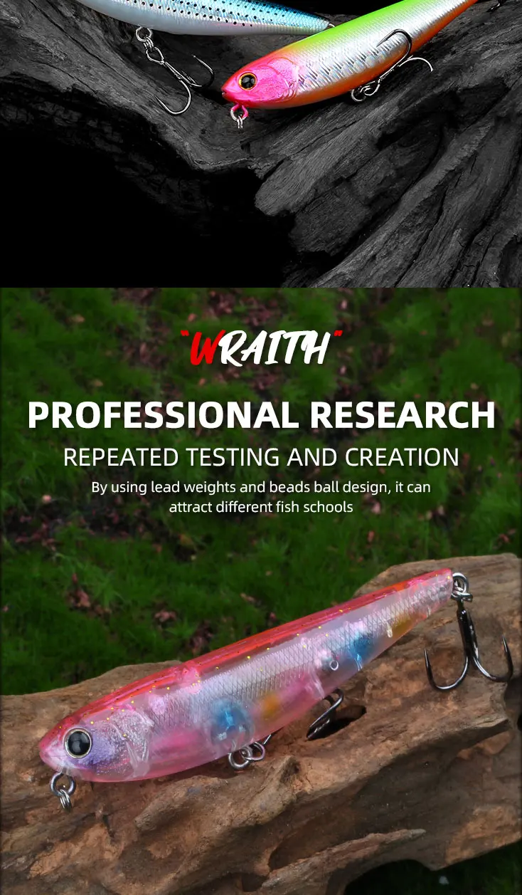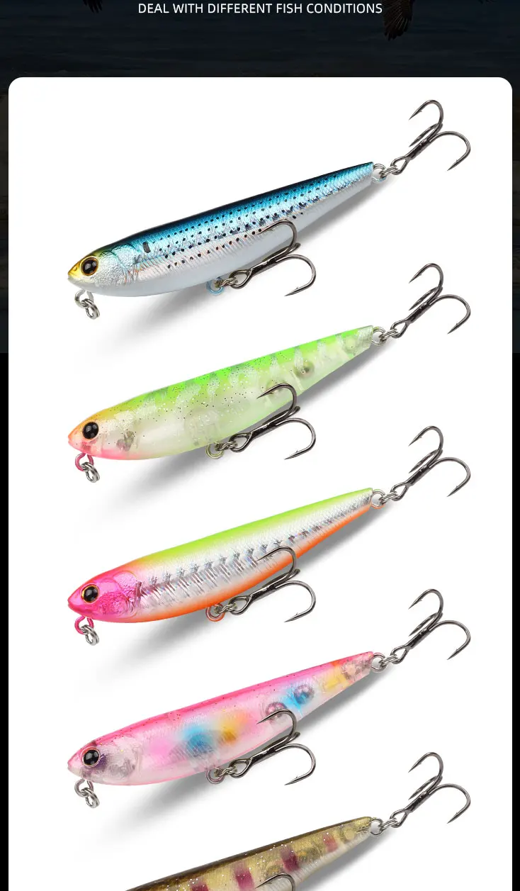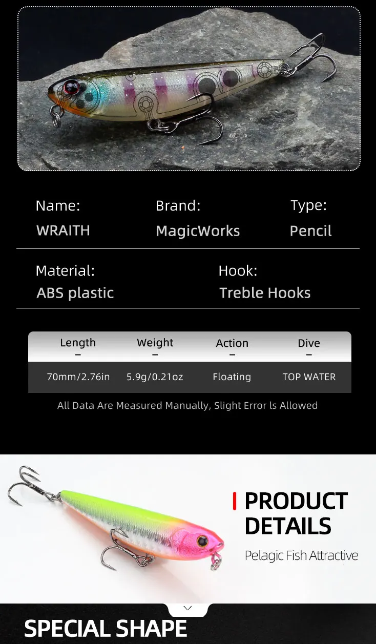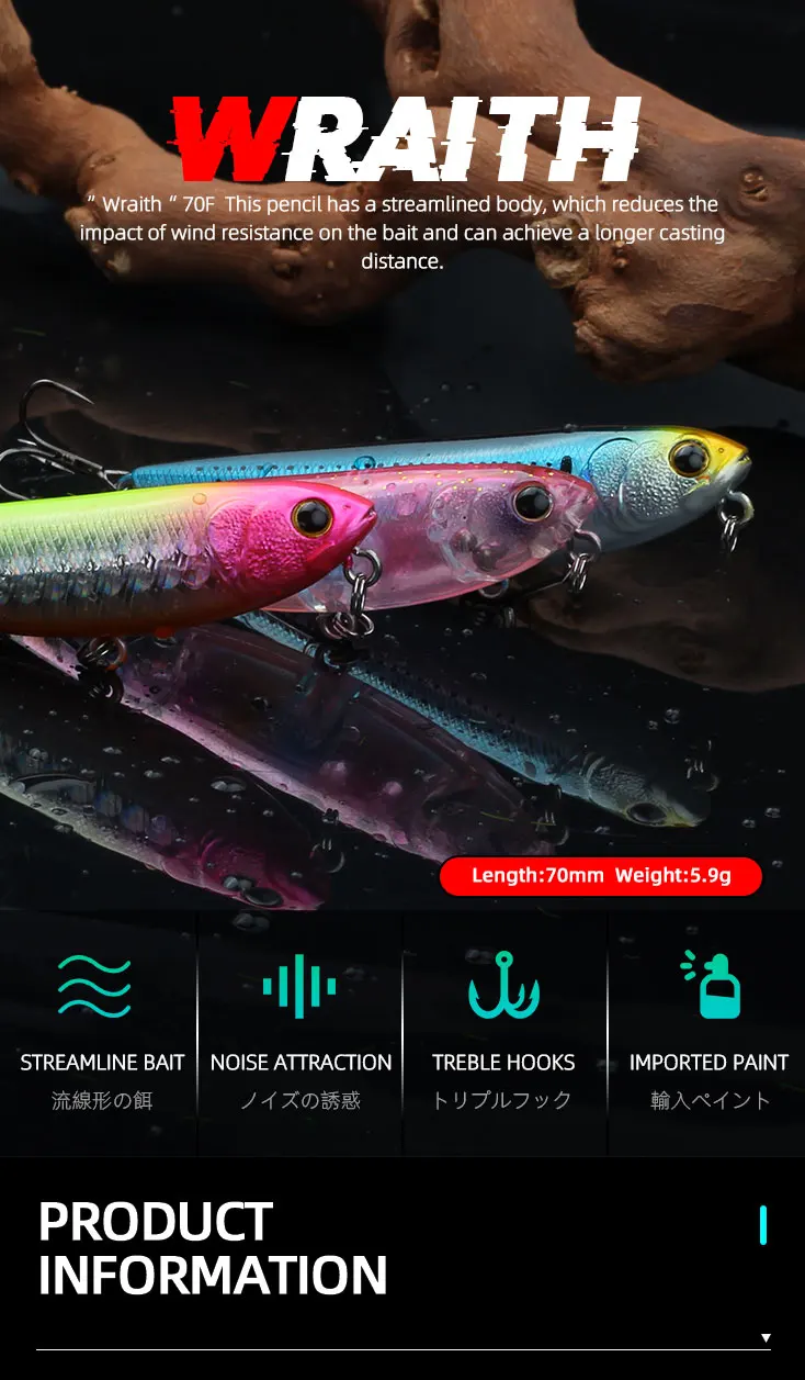 1.This pencil has a streamlined body which reduces the impact of wind resistance on the bait and can achieve a longer casting distance.