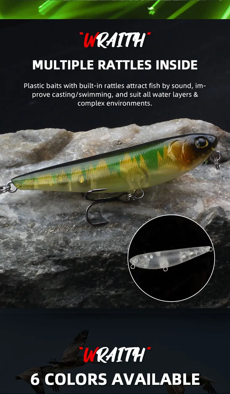 6.Plastic baits with built-in rattles attract fish by sound, improve casting/swimming, and suit all water layers &complex environments.
