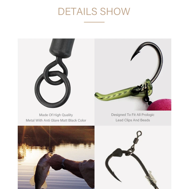 Feature: Carp Fishing Swivels made of high quality metal with anti Glare matt black color.Designed to fit all prologic lead clips and beads.Especially designed swivels to make changing hooks quicker and easier than ever before.Various applications,it can be used with stiff rigs,chod rigs and combi rigs etc.