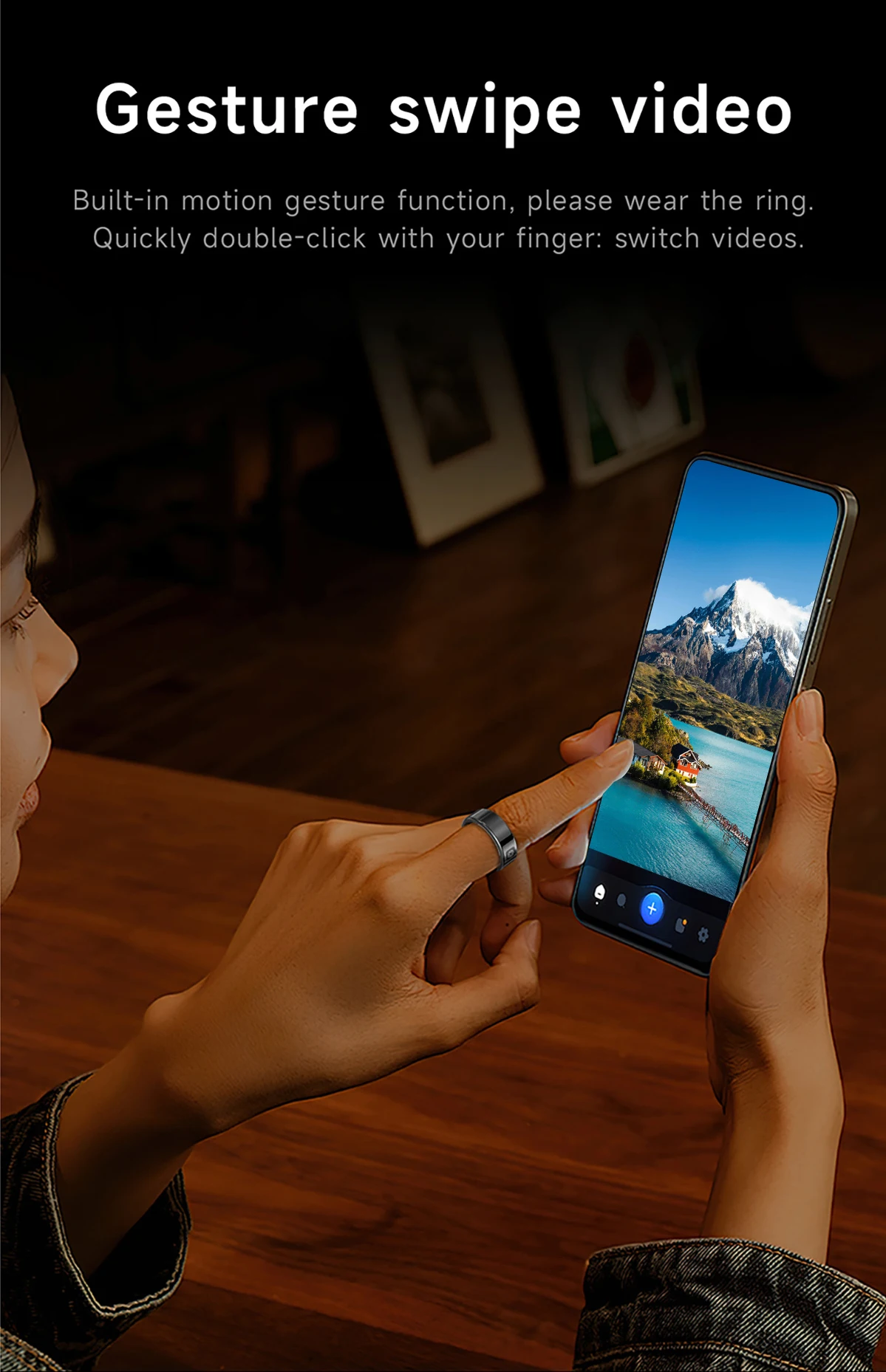 1.Gesture swipe video:Built-in motion gesture function, please wear the ring.