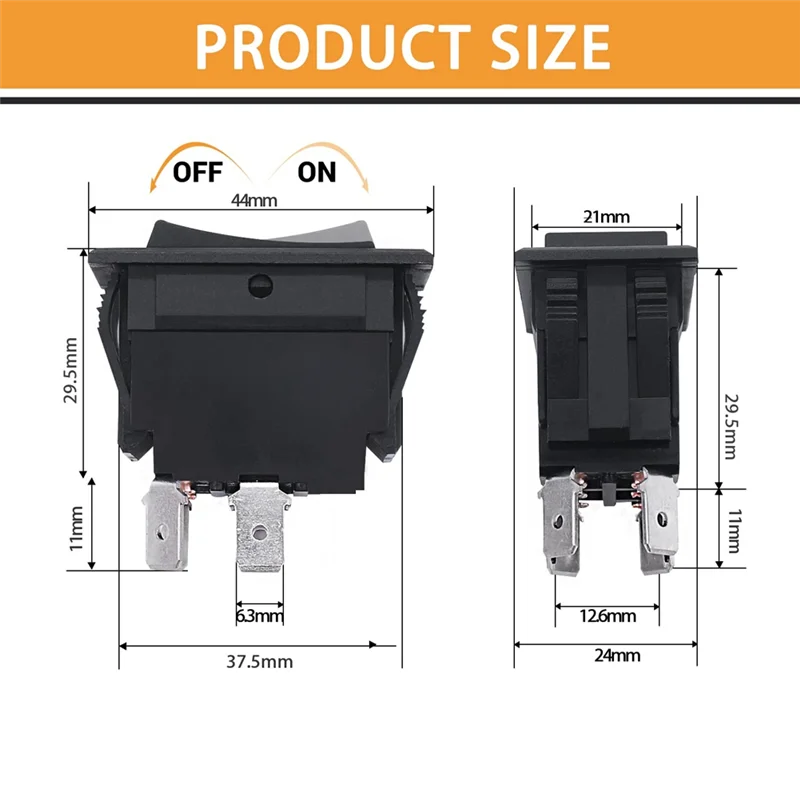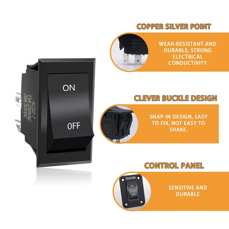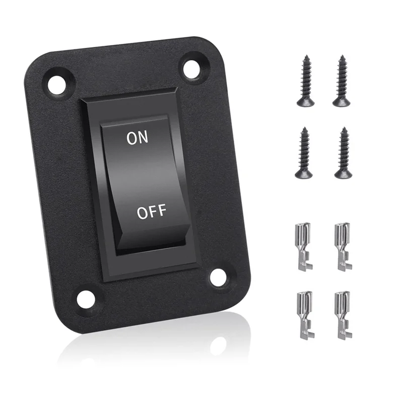 The switch is made of insulating plastic shell and copper pin,low resistance, good contact, safety and longevity.The panelmade of high-quality aluminum, very strong, not easy to tear, and long in service life. Products are suitable for 15A 250VAC 20A50VDC.Note: Please turn off the power before installation. Switch size: 45mmx20mmx45mm/1.75inchx0.76inchx1.77inch(LxWxH);Panel size: 70mmx49mm/2.63inchx1.92inch(LxW). Rocker switch adopts snap-in design,easy to install.Terminal Type:DPST, easy to turn ON/ OFF.Rocker switches are commonly used for lights, pumps, fans, vents, and many other uses in RVs, Buses, Horse Trailer Conversions, Haulers, Travel Trailers, Boats and more.