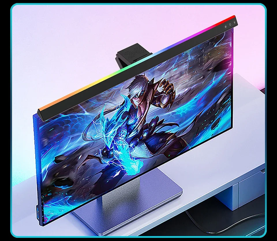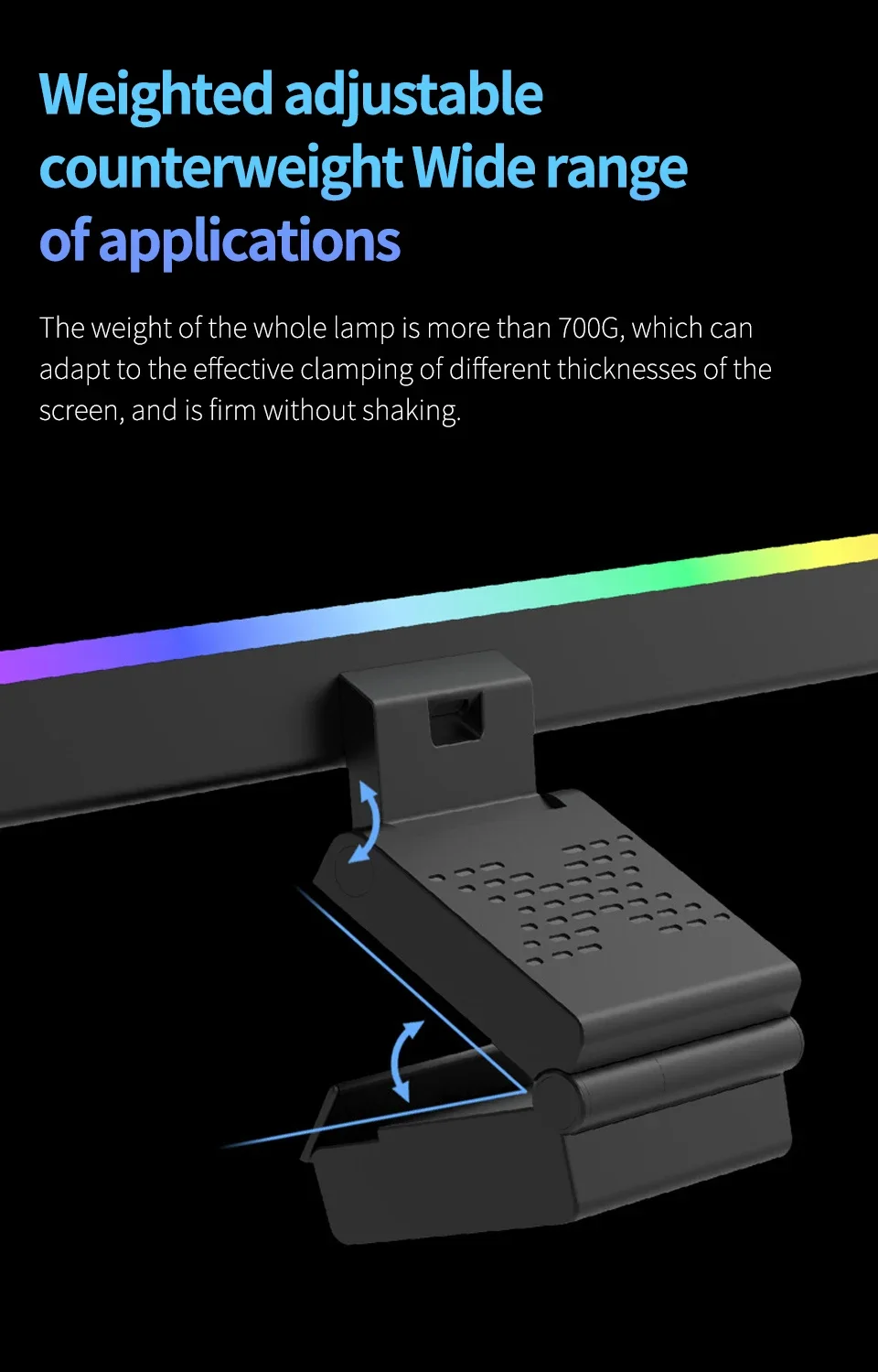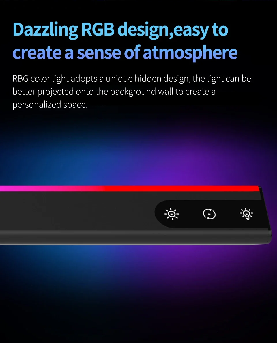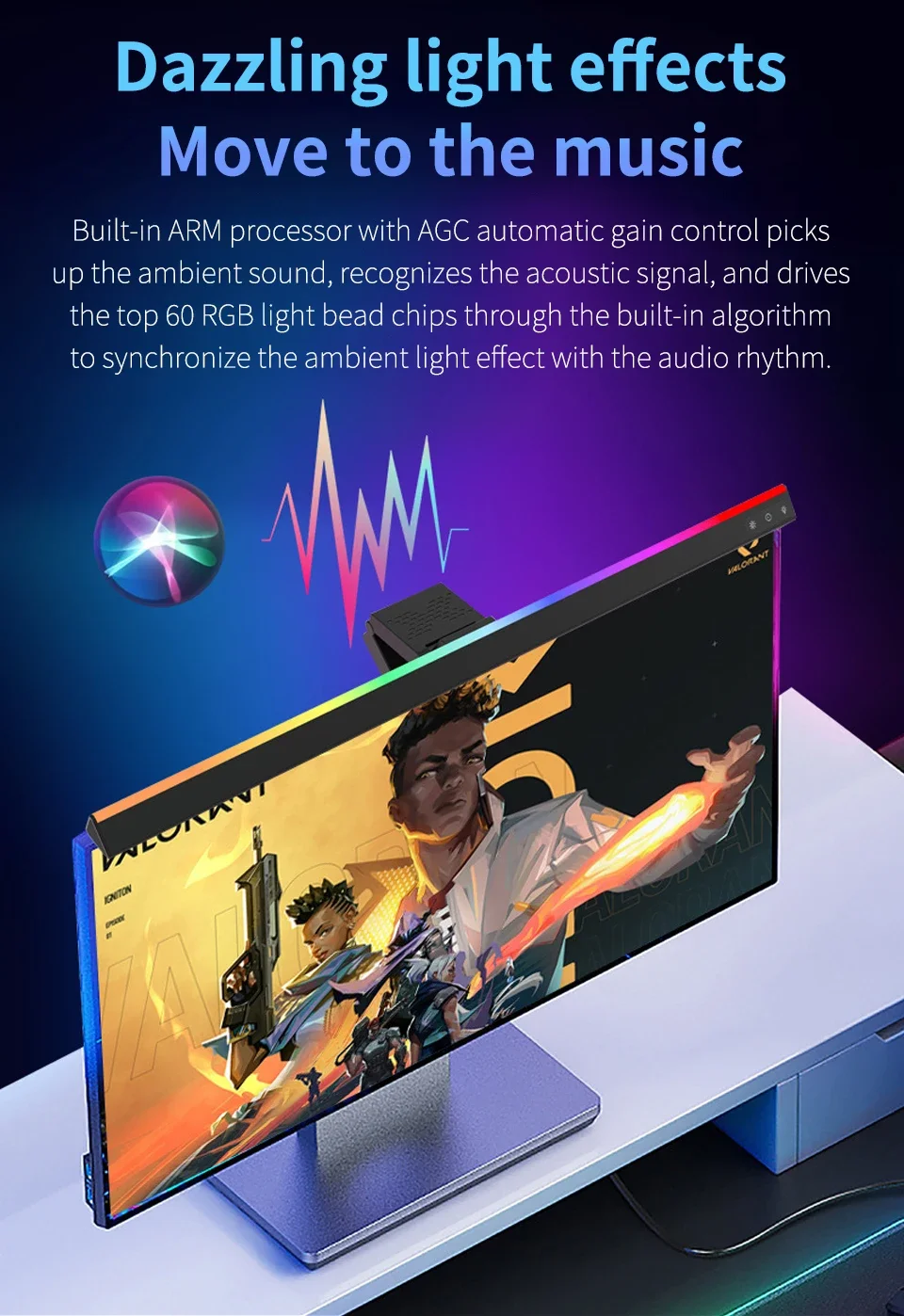 --Dynamic Music Rhythm Modes.Synchronize the light with your music, just like a pet that matches your mood, bringing you a unique lighting experience. If you have an RGB keyboard, mouse, and desk pad... You NEED this moitor light bar to finish the look! It looks amazing and is super functional and really does bring life to your WORKING & GAMING life. ---Front & Back Dual Light Source, Enhanced Eye Comfort - monitor light bar features an innovative design with complementary front and back light sources, minimizing glare caused by light-dark contrast and providing more uniform balanced lighting across your screen and surrounding area. The front light specifically illuminates your desk area, enhancing focus during work, while backlight provides gaming ambient dynamic lighting. Enhances overall eye comfort whether you're working or relaxing. ---No Blue Light Hazard & Flicker-Free Lighting - Our computer light bar with backlight effectively eliminates harmful blue light that may affect vision, reducing eye irritation and providing optimal eye protection. Enjoy our flicker-free illumination that provides a stable light source without worrying about eye discomfort. Create a more comfortable reading and gaming environment with RGB monitor light and experience truly comfortable, eye-friendly lighting. ---Touch Dimming.Short Touch the left mark: Turn On/Cycles Dynamic Effect(toal 6 types); Long Touch Turn Off Dynamic Effect. Short Touch the right mark: Turn On/Off. Short Touch the middle mark to Cycles 5 kinds of Light Color; Long Touch to Dimming.
