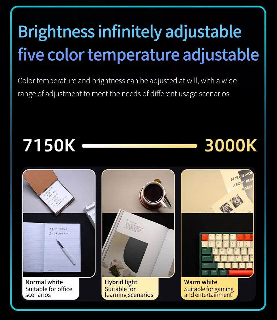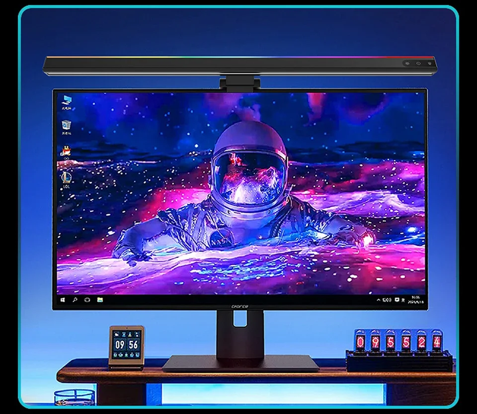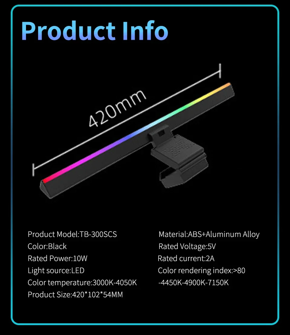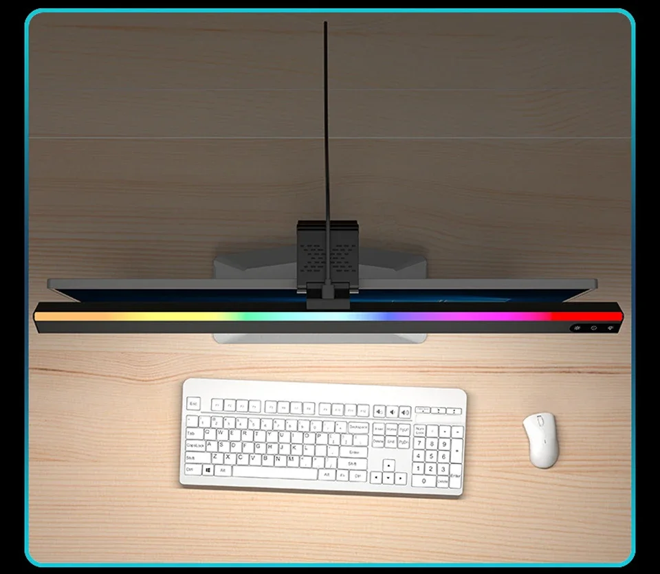 --Dynamic Music Rhythm Modes.Synchronize the light with your music, just like a pet that matches your mood, bringing you a unique lighting experience. If you have an RGB keyboard, mouse, and desk pad... You NEED this moitor light bar to finish the look! It looks amazing and is super functional and really does bring life to your WORKING & GAMING life. ---Front & Back Dual Light Source, Enhanced Eye Comfort - monitor light bar features an innovative design with complementary front and back light sources, minimizing glare caused by light-dark contrast and providing more uniform balanced lighting across your screen and surrounding area. The front light specifically illuminates your desk area, enhancing focus during work, while backlight provides gaming ambient dynamic lighting. Enhances overall eye comfort whether you're working or relaxing. ---No Blue Light Hazard & Flicker-Free Lighting - Our computer light bar with backlight effectively eliminates harmful blue light that may affect vision, reducing eye irritation and providing optimal eye protection. Enjoy our flicker-free illumination that provides a stable light source without worrying about eye discomfort. Create a more comfortable reading and gaming environment with RGB monitor light and experience truly comfortable, eye-friendly lighting. ---Touch Dimming.Short Touch the left mark: Turn On/Cycles Dynamic Effect(toal 6 types); Long Touch Turn Off Dynamic Effect. Short Touch the right mark: Turn On/Off. Short Touch the middle mark to Cycles 5 kinds of Light Color; Long Touch to Dimming.
