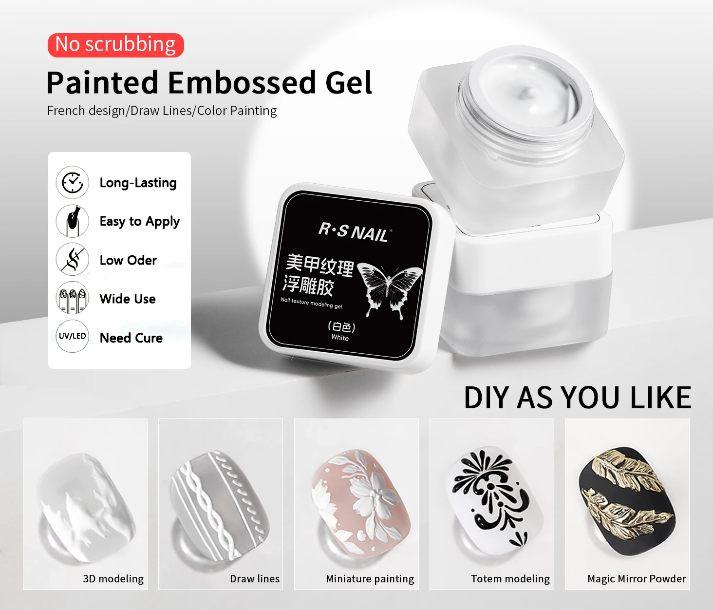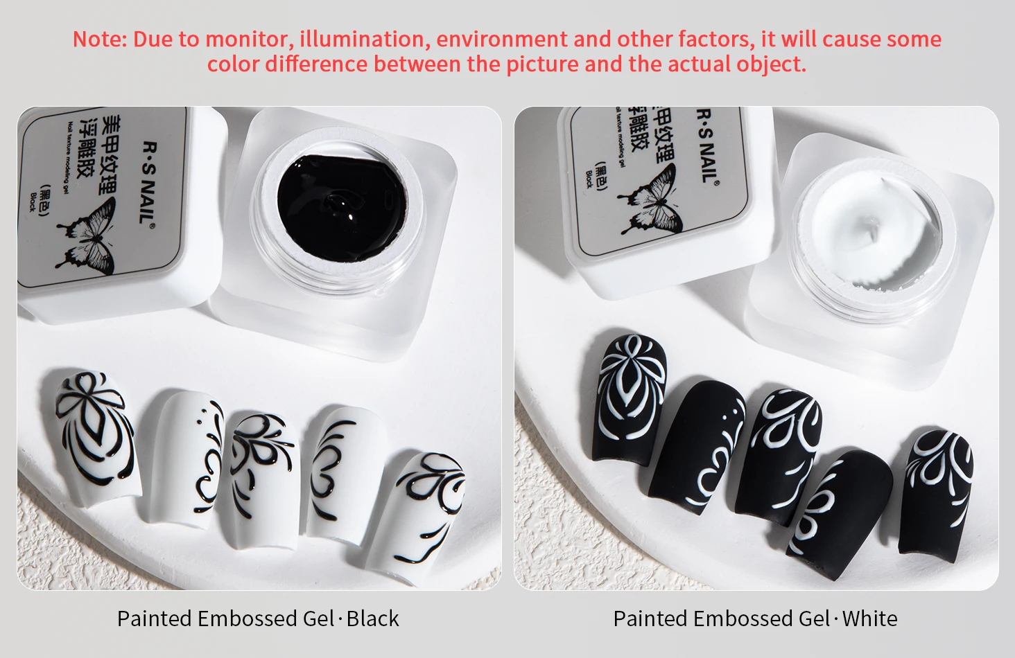 Brand: RS NAIL Type: Embossed Nail Gel Polish Capacity: 5g Suitable Lamp: UV Lamp or LED Lamp Package Contents:1 bottles