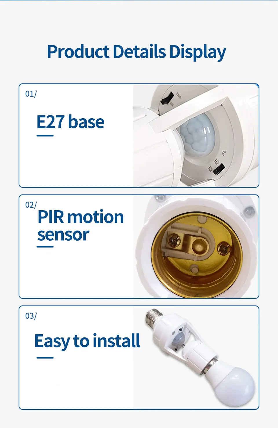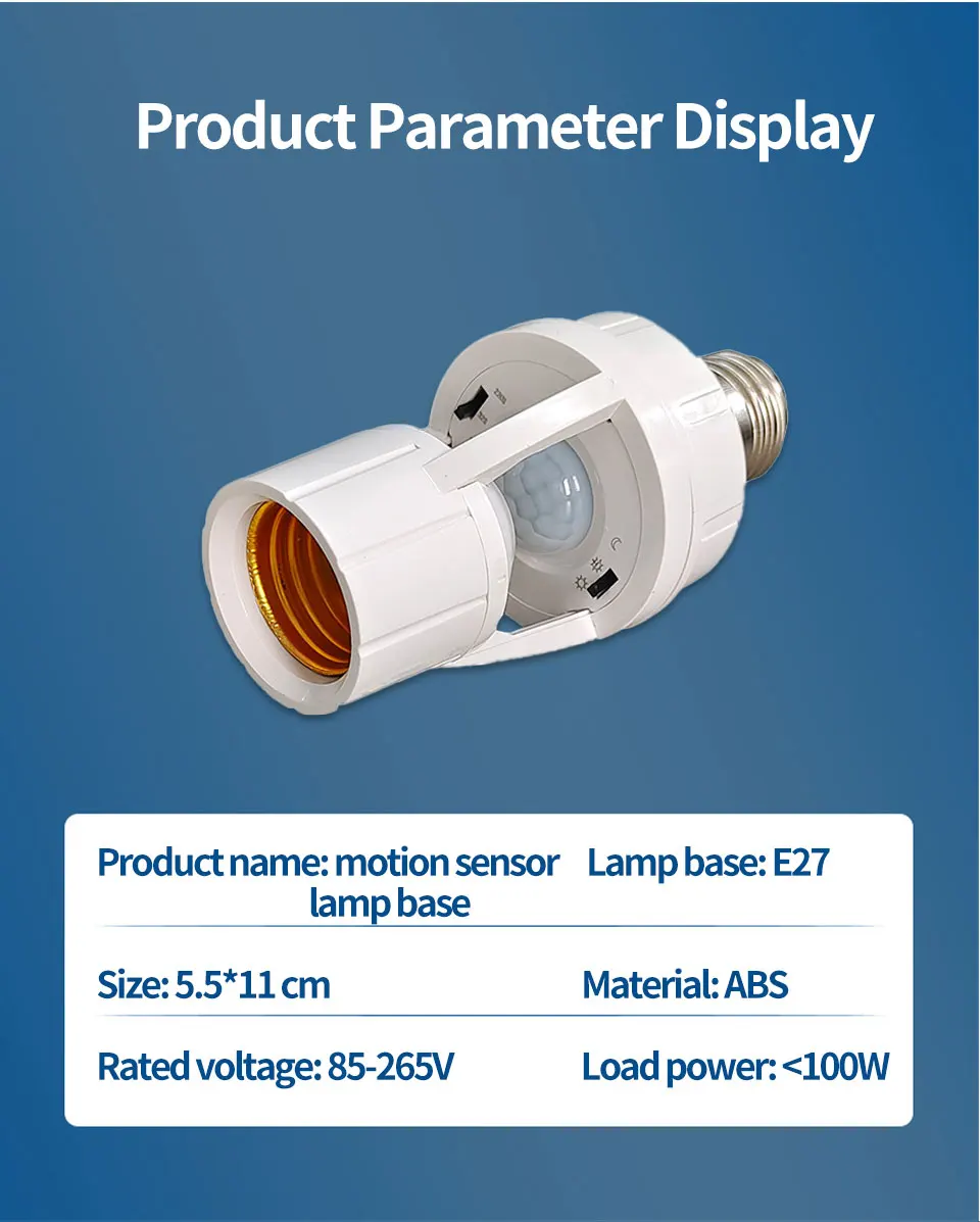 Easy to install and used widely Can identify day and night automatically Adopts good sensitivity detector, integrated circuit Can start the load at once when one enters detection field Utilizes the infrared energy from human as control-signal source Gathers automatism, convenient safe, saving-energy and practical functions