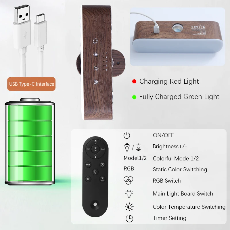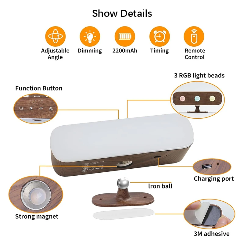 【High quality specifications】The lamp is equipped with a 2200mAh battery that provides long-lasting power. It has a USB Type-C interface for easy charging. The charging status displays a red light when charging and a green light when fully charged. The lamp also includes a function button for easy access to various settings, as well as a strong magnet and 3M adhesive for safe installation.