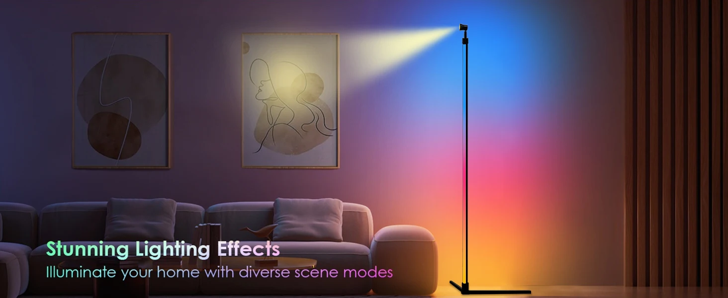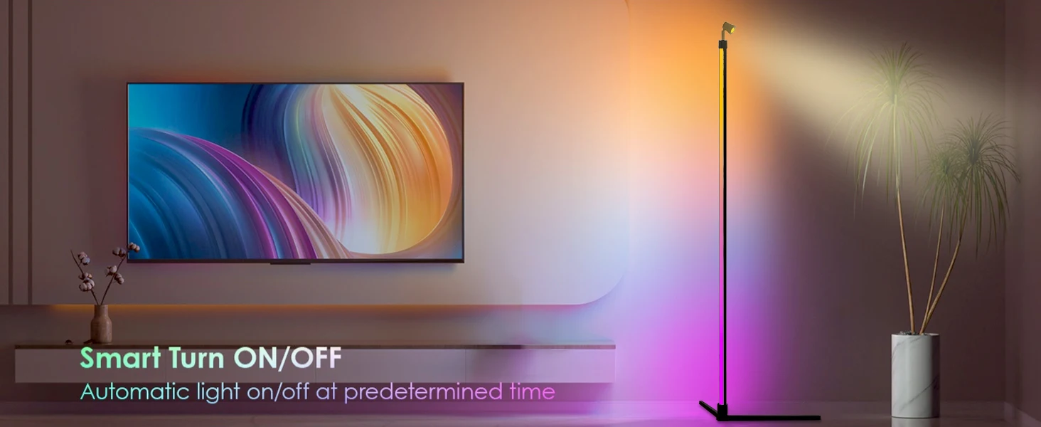 Colorful & Intelligent Home Lighting System The LED floor lamp has a built-in low power consumption and soft light RGB strip, RGB/IC technology has 16 million colors to illuminate your home, no longer limited to mundane lighting, you can freely adjust the color of the lamp to create warm, romantic, comfortable or inviting atmosphere.
