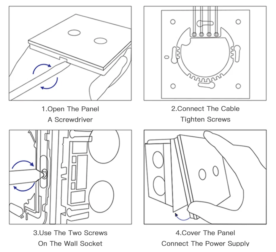 Always turn off the main power during installation until the panel installation is complete, and then turn it on. If you test the switch by touching the directly (without the cover panel), turn it off for 5 minutes, place it on the control panel, and use it.