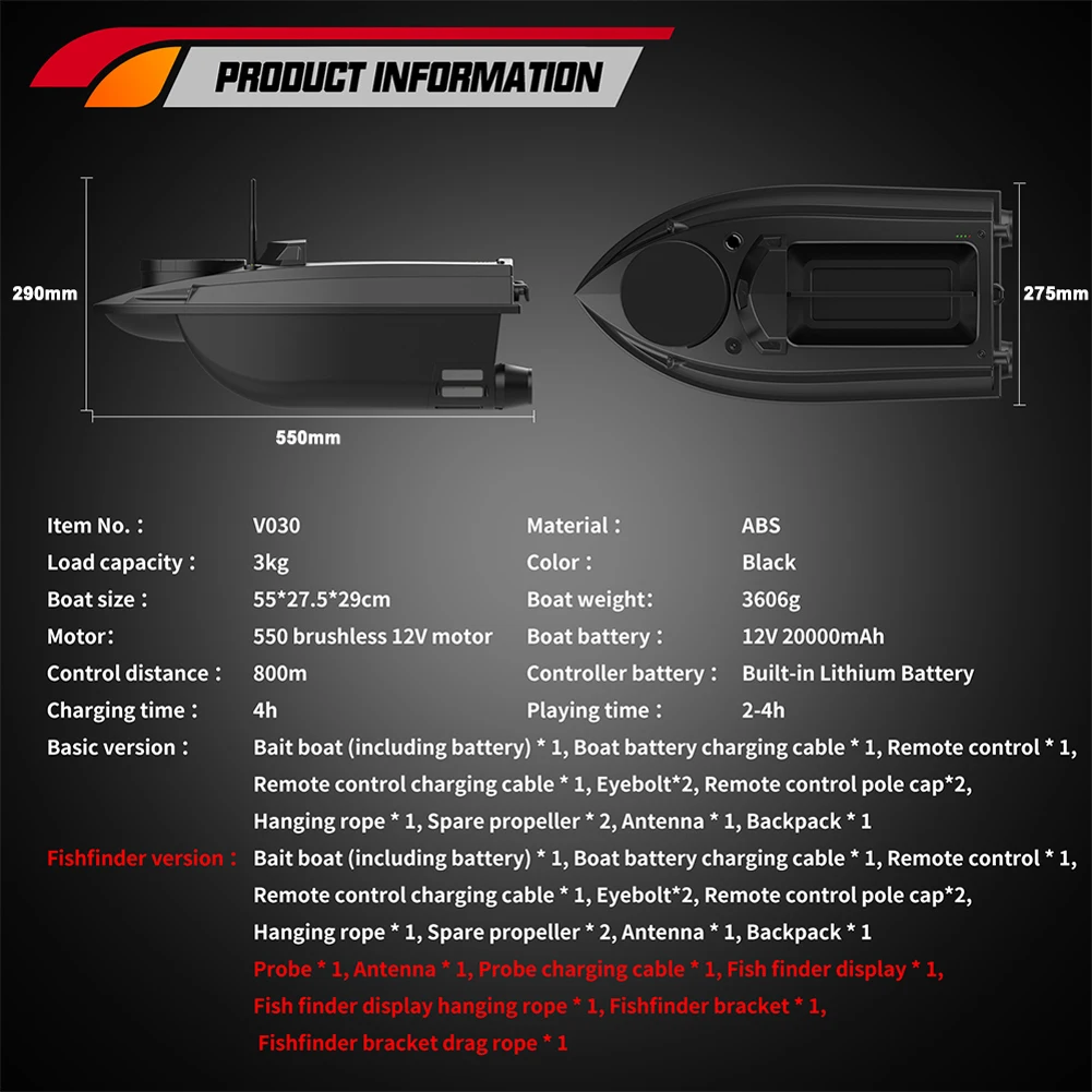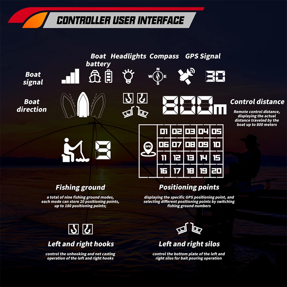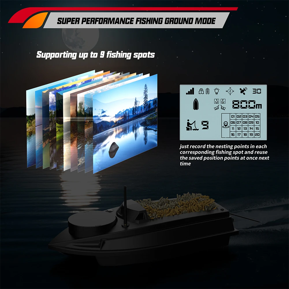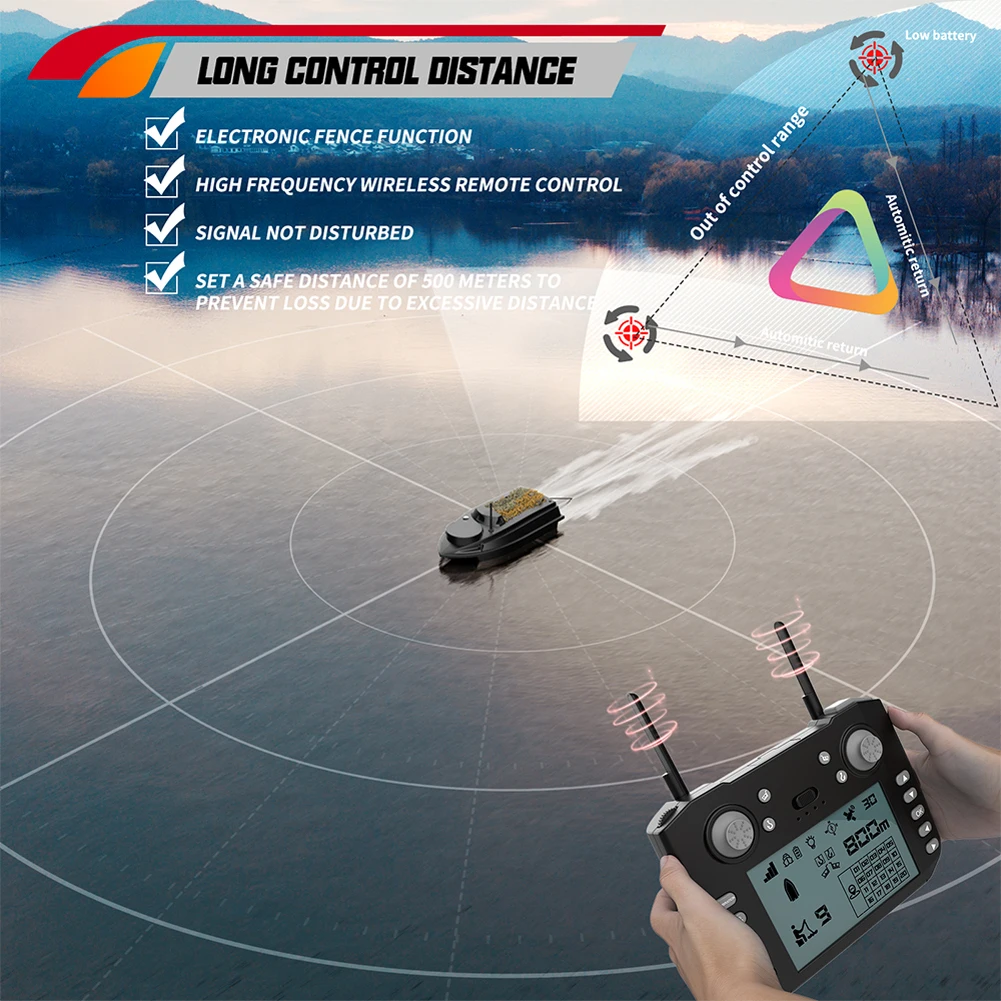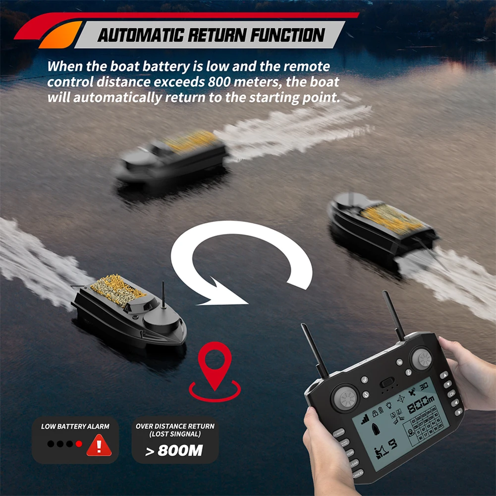 【Intelligent Return System】: Built-in intelligent return system adds a lot of convenience for you. It can return to the starting point with one button after baiting or hooking, or return to the starting point automatically when low battery, remote signal loss, or exceeding the safety range.