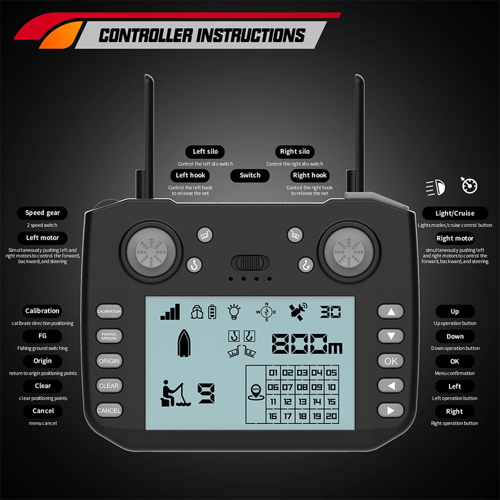 【4.3-inch Clear Display Remote Control】: It comes with a user-friendly remote control featuring a large 4.3-inch clear display. This dual-purpose controller provides real-time information on distance, position, battery level, bait release, direction, and signal strength, ensuring clear visibility and effortless operation.