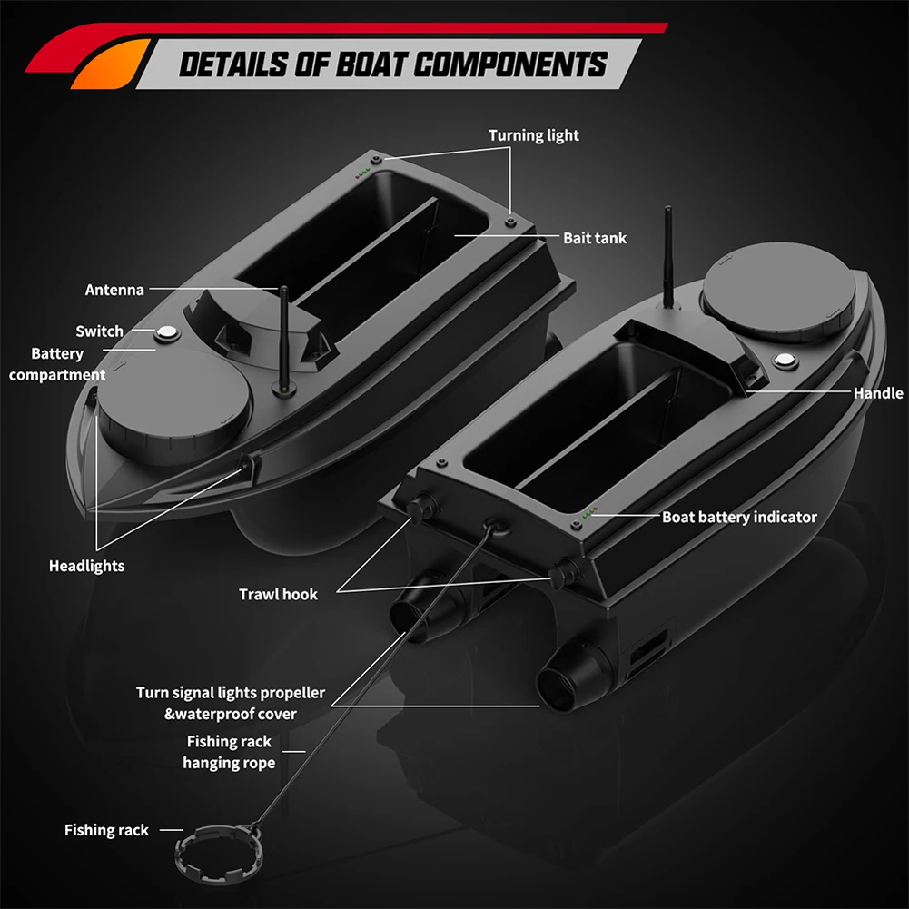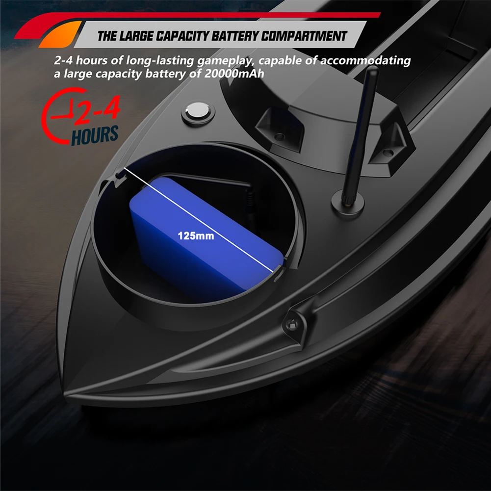 【Large Capacity Bait Compartment】: The fishing bait boat features an detachable partition in the bait compartment, allowing for easy transformation into a large storage compartment with a 3kg load capacity. This versatile design ensures ample space for all your fishing needs.