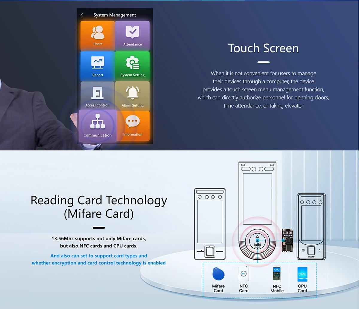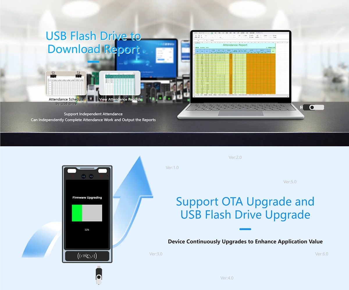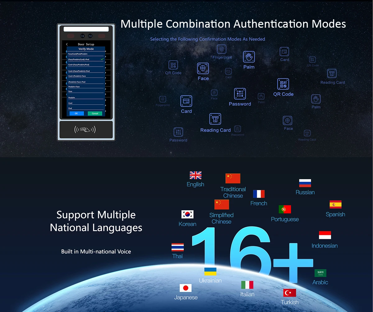 Registration Methods:Face, Palm Vein, Password,Mifare card,QR Code.