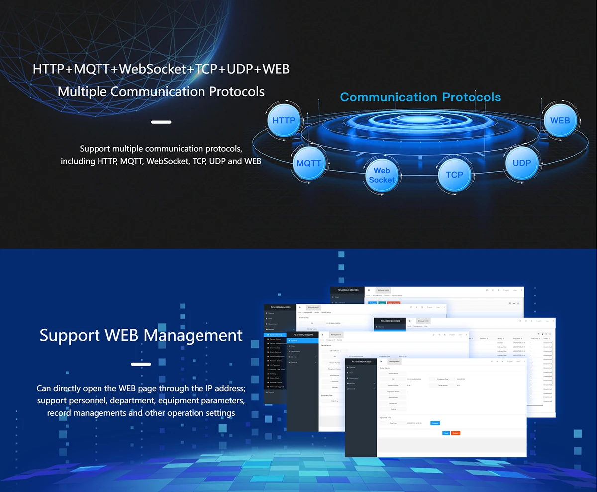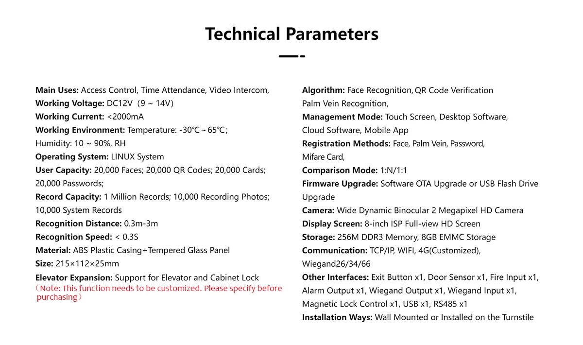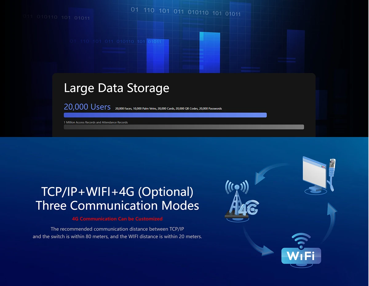 User Capacity:20,000 Faces;20,000 QR Codes;20,000 Cards;20,000 Passwords.