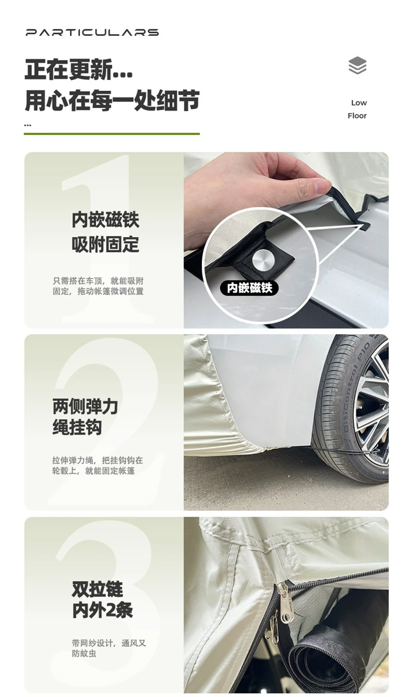 Double layer design of gauze mesh and sunscreen cloth door,Wide view and excellent ventilation effect.Two way double zipper can be opened both inside and outside!